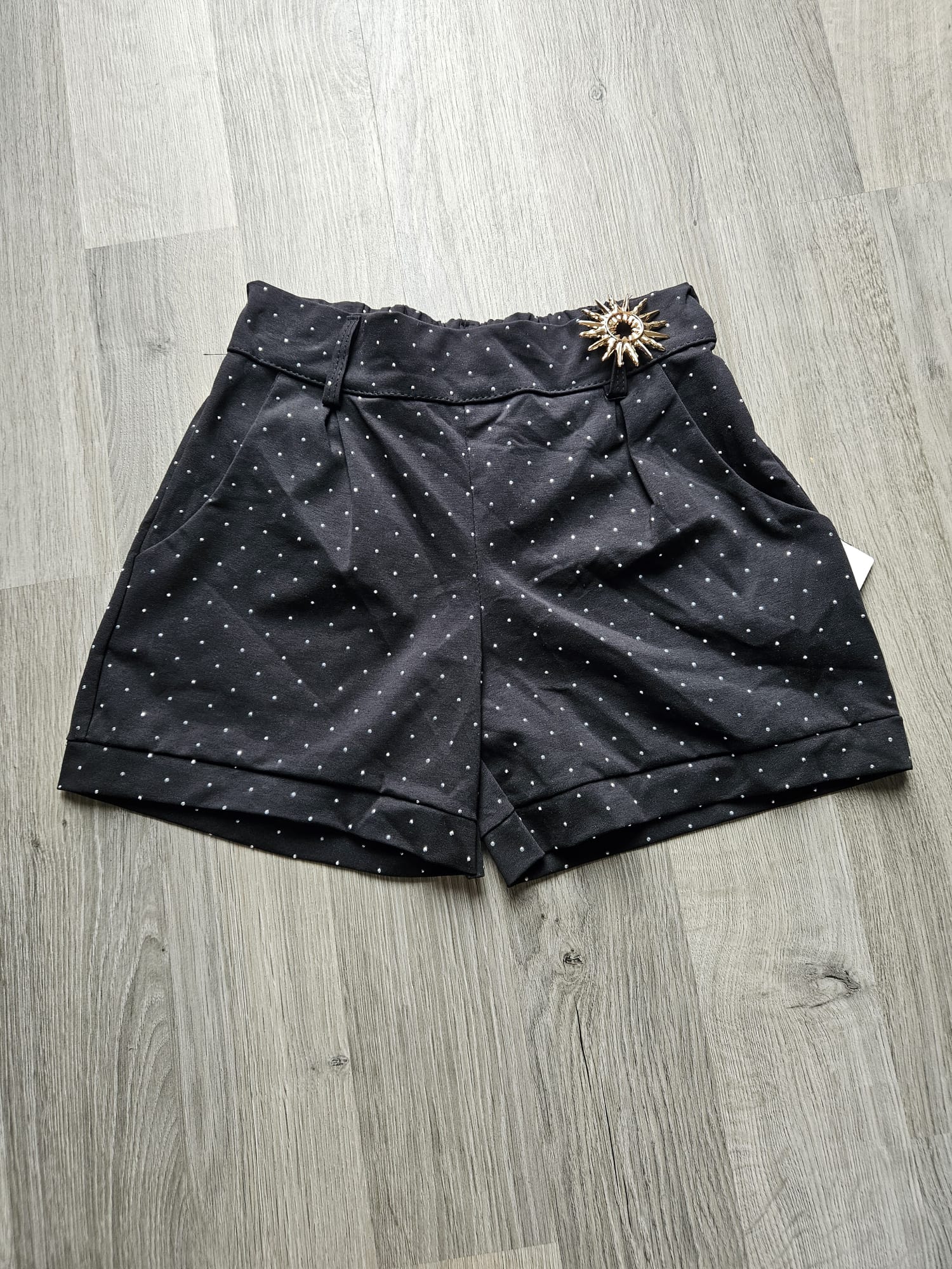Czarne spodenki z kieszeniami ozdobione cekinkami i ozdobną agrafką którą można zdjąć w dowolnym momencie.
