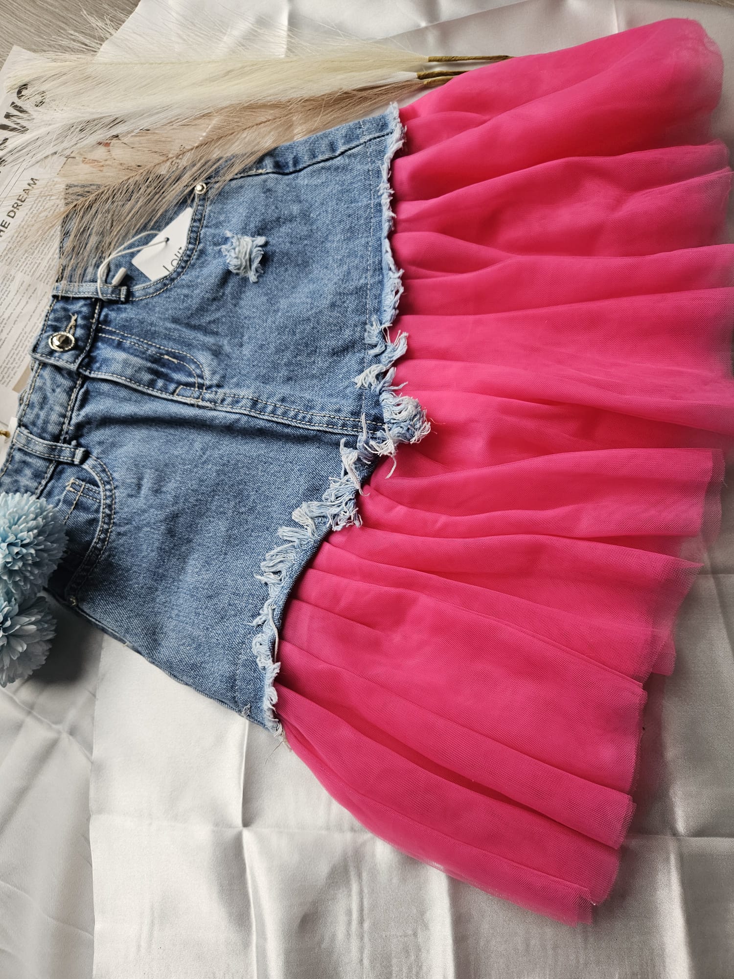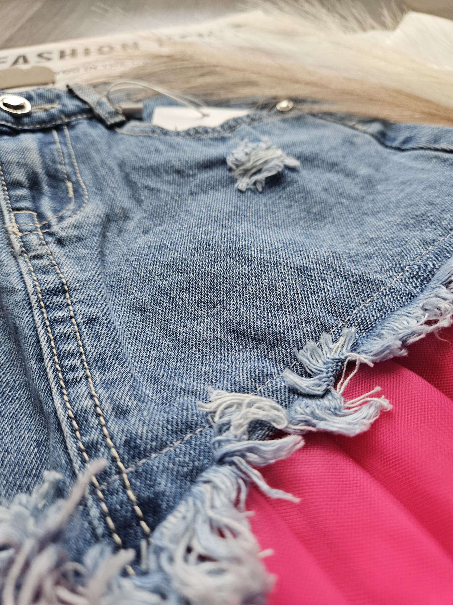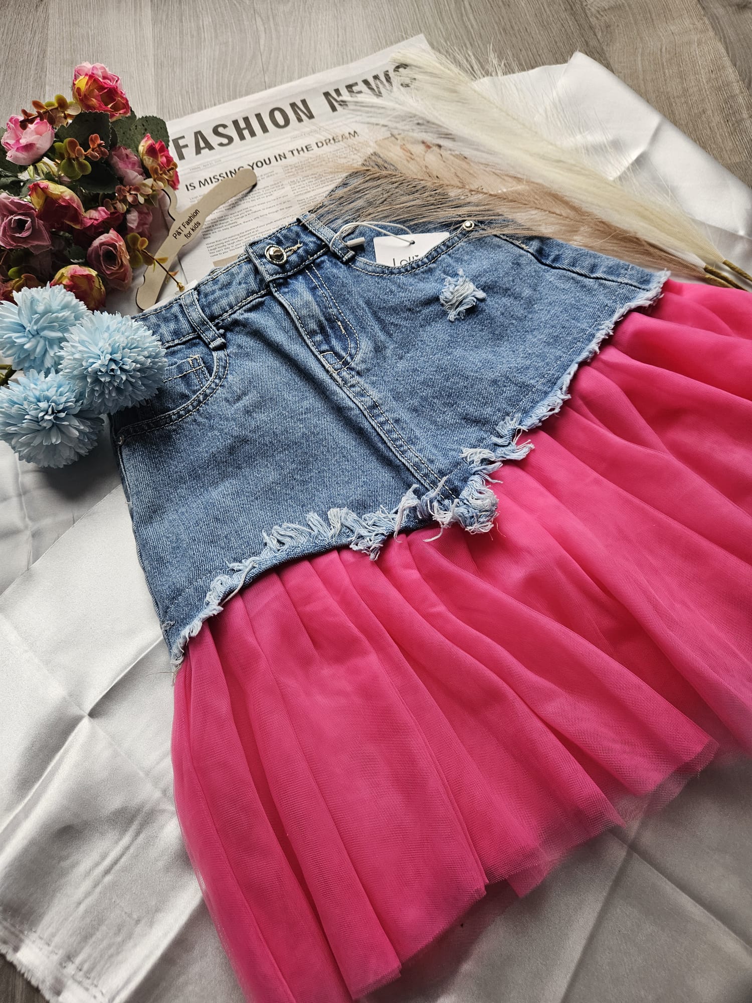 Modna spódniczka dziewczęca łącząca klasyczny jeans z efektowną warstwą różowego tiulu. Góra wykonana z jeansu, dół z lekkiego, zwiewnego tiulu, który nadaje stylizacji wyjątkowego charakteru.