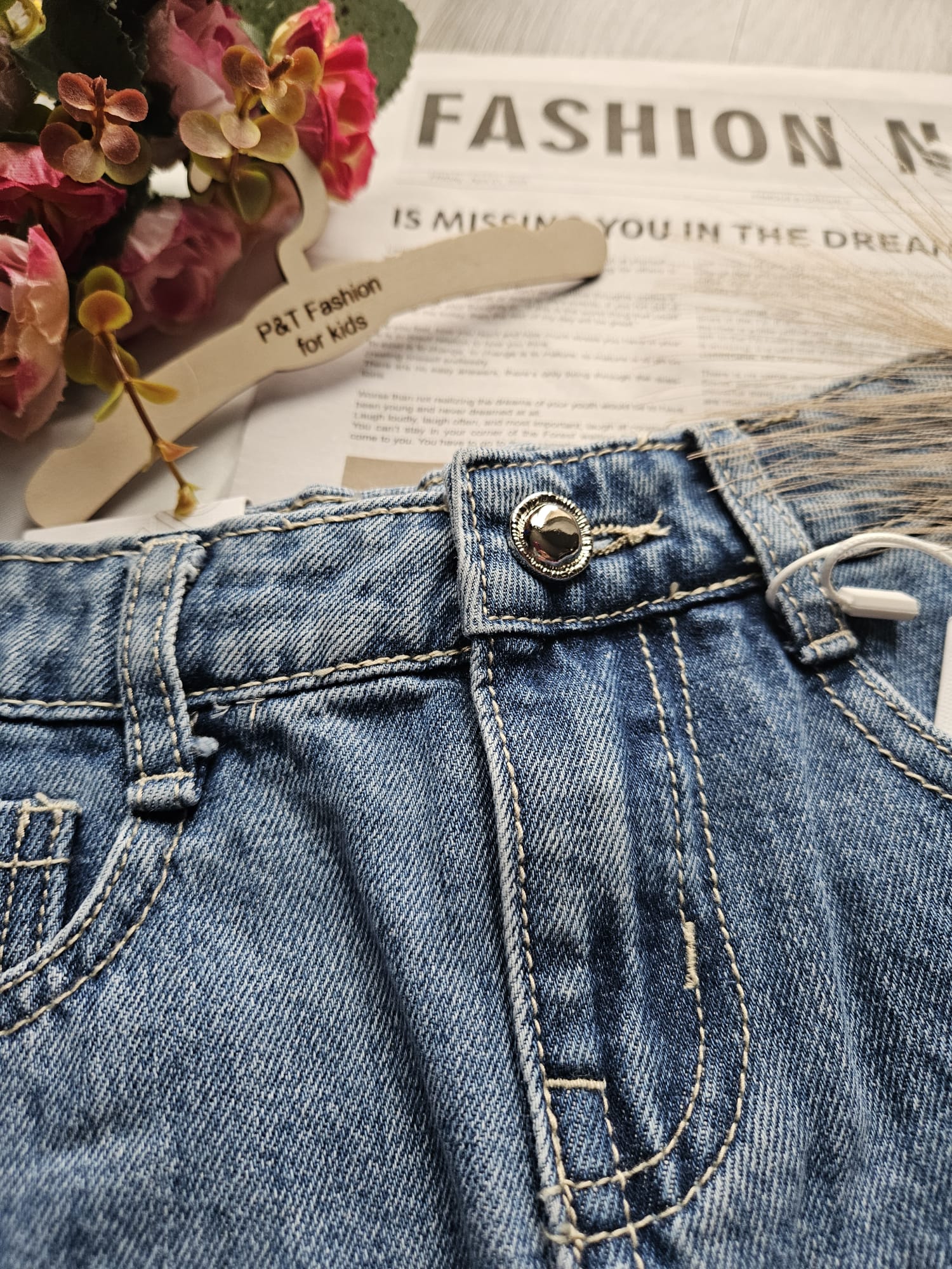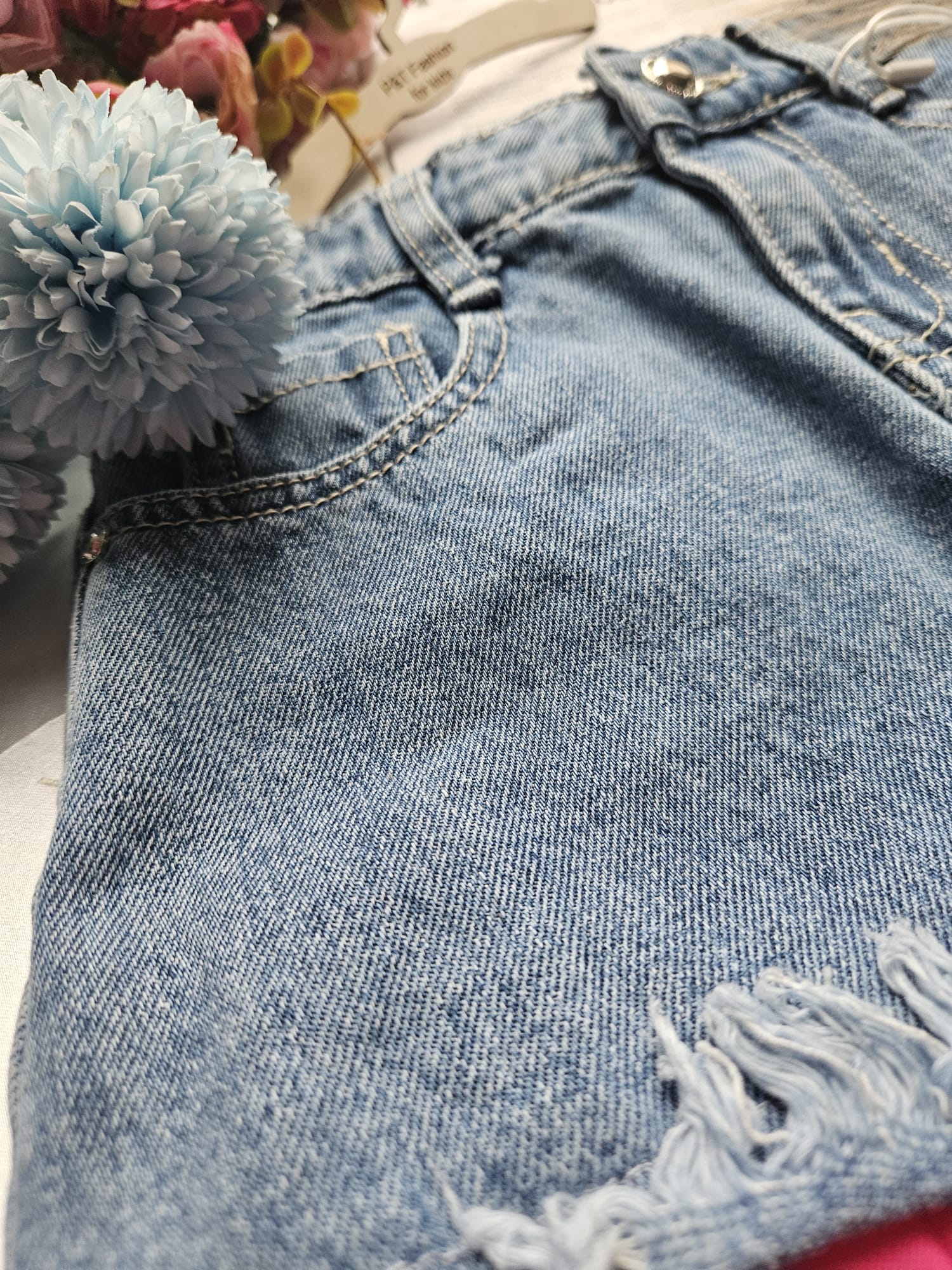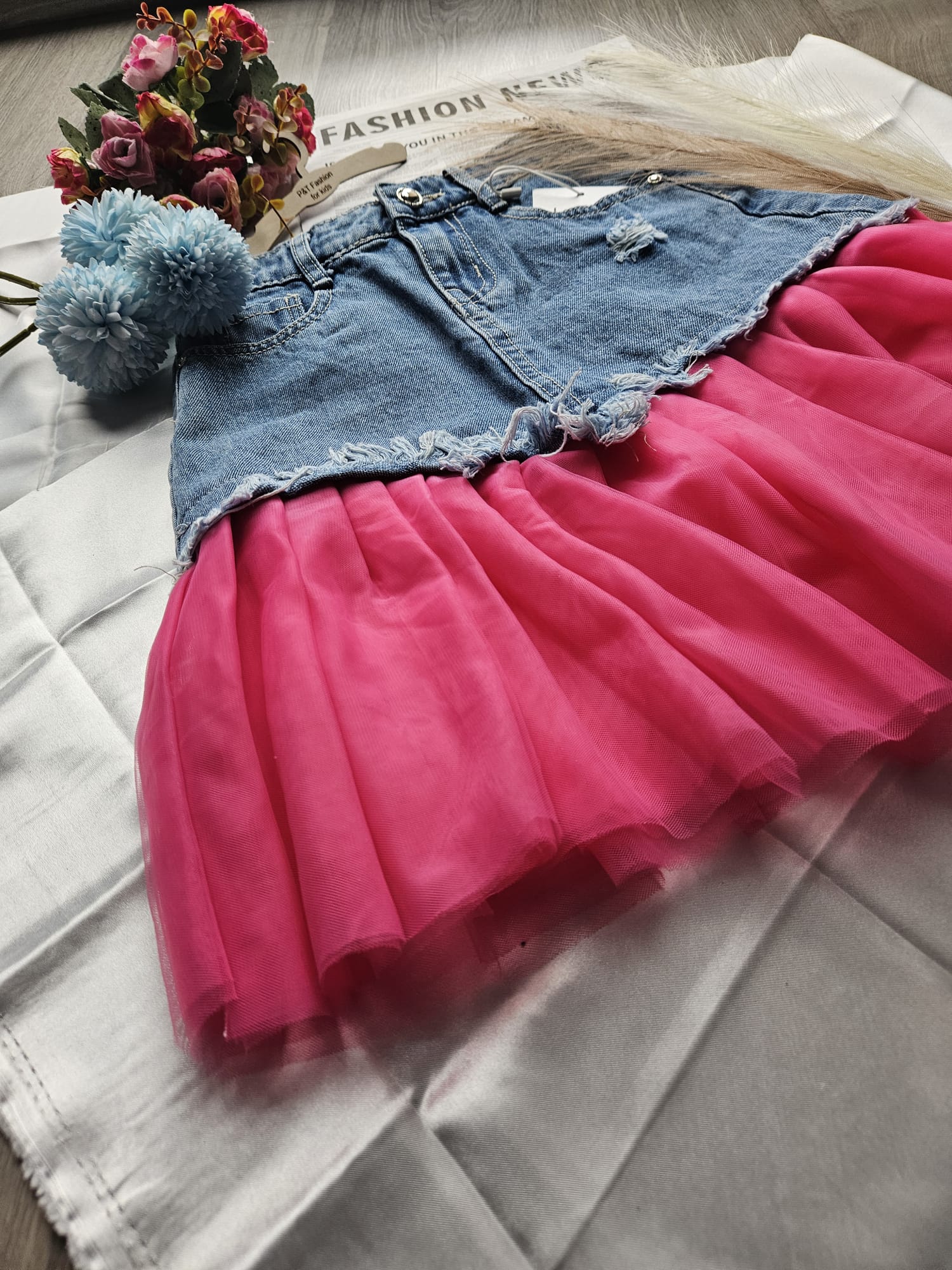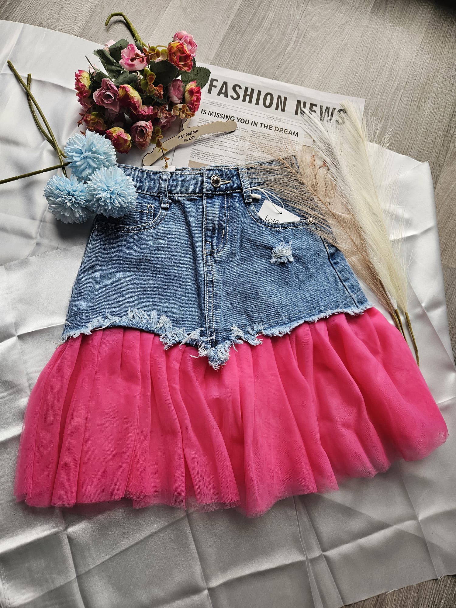 Modna spódniczka dziewczęca łącząca klasyczny jeans z efektowną warstwą różowego tiulu. Góra wykonana z jeansu, dół z lekkiego, zwiewnego tiulu, który nadaje stylizacji wyjątkowego charakteru.