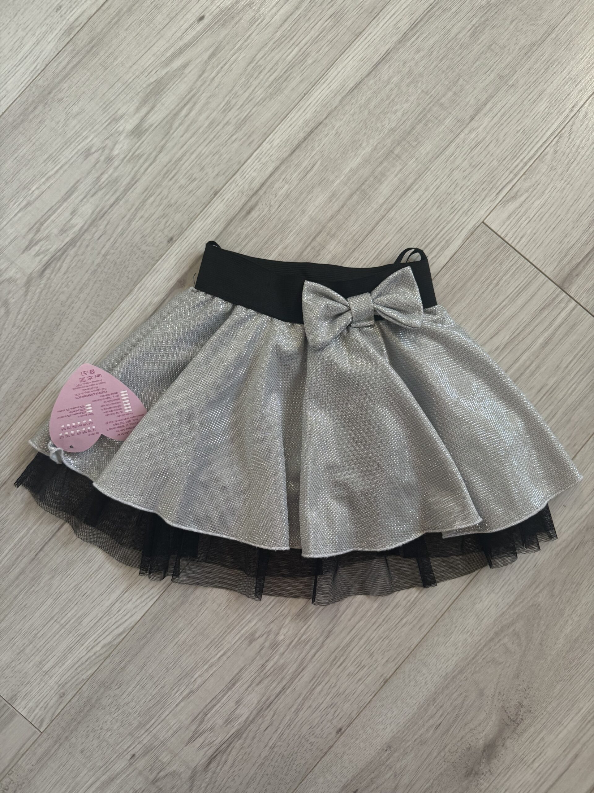 Spódniczka srebrna świecąca z czarnym tiulem oraz ozdobną kokardą