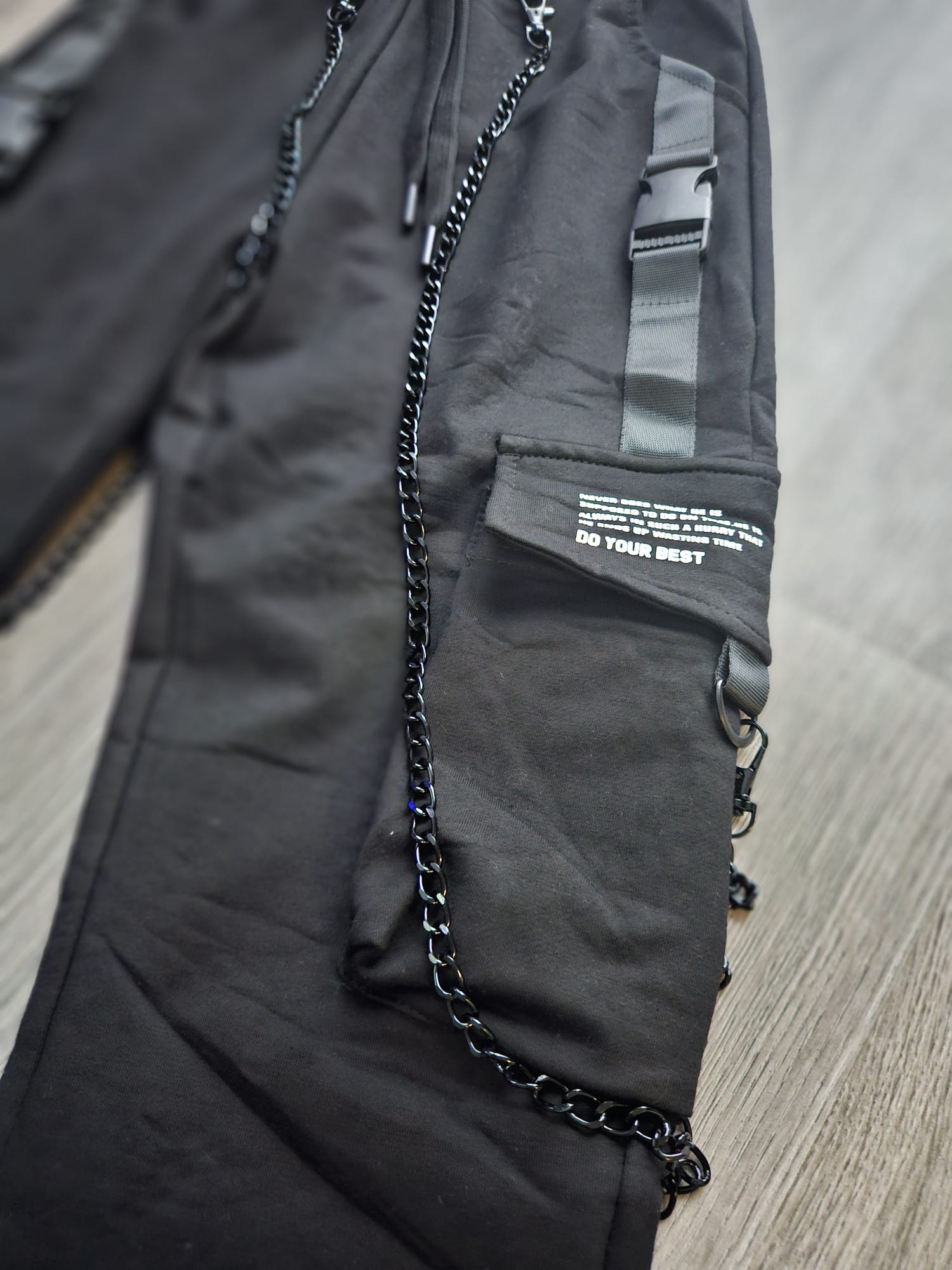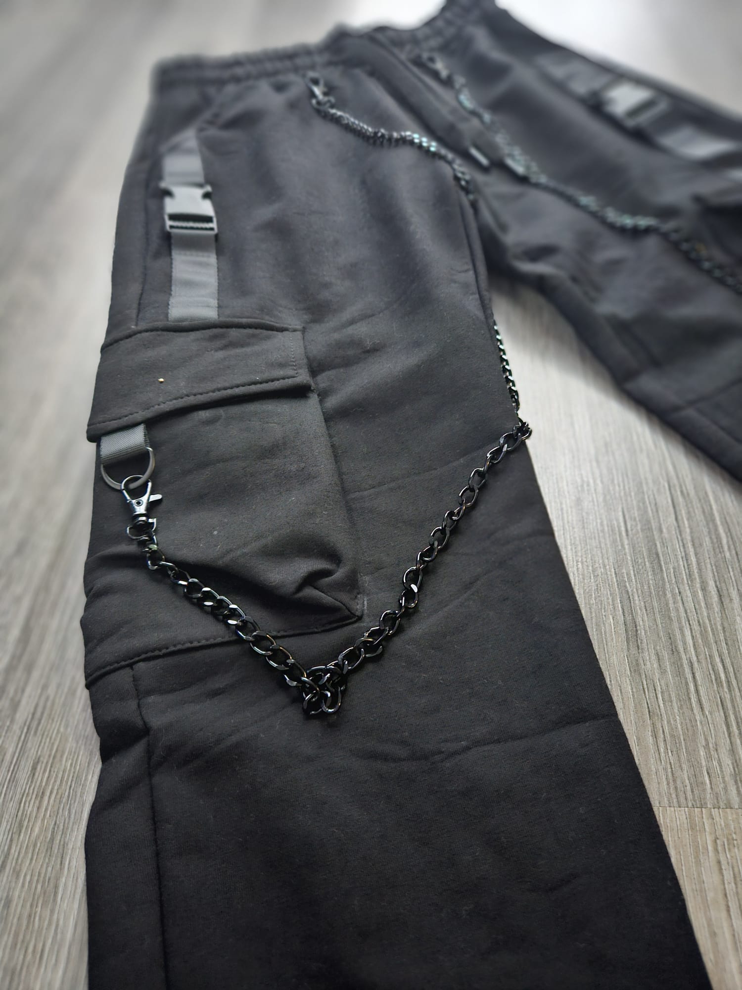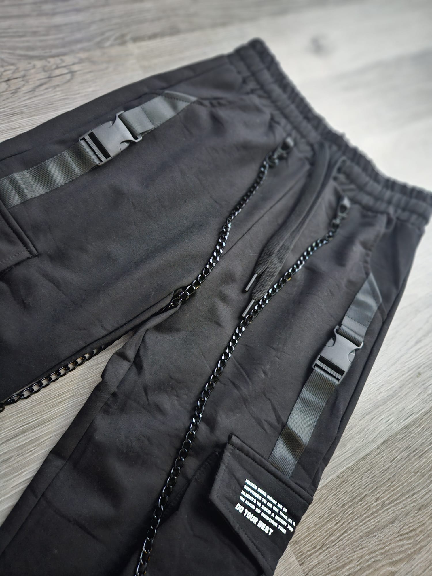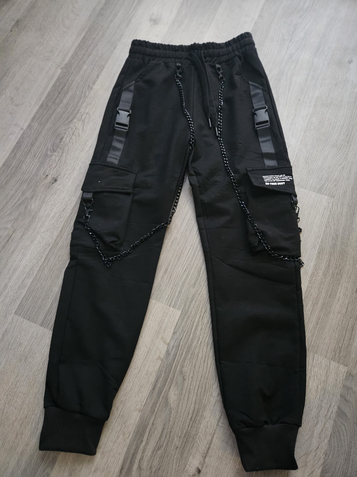 Czarne spodnie z kieszeniami i gumką w pasie mają dopięte z przodu łańcuszki, które można zdjąć. Komfortowe, praktyczne i stylowe
