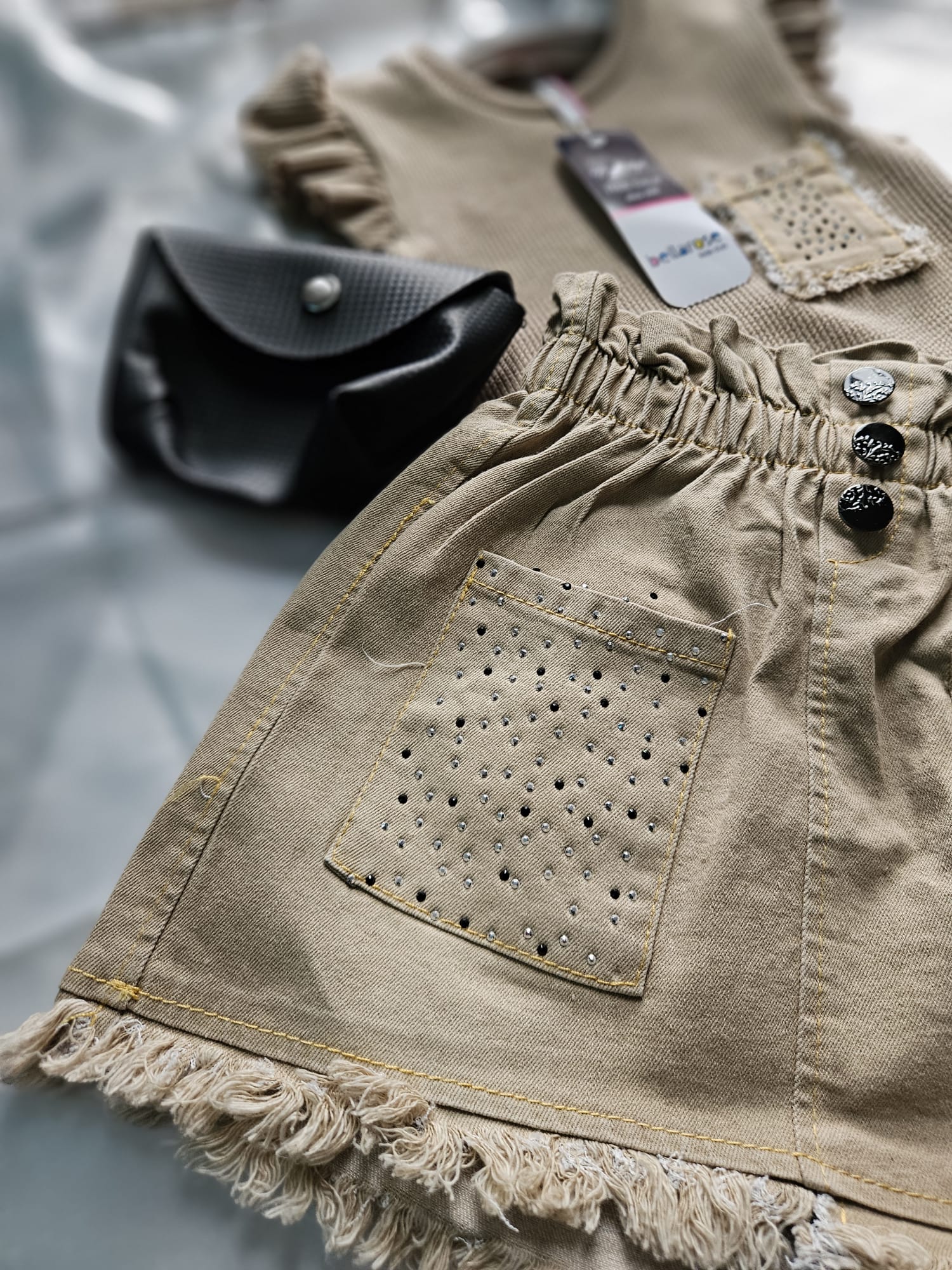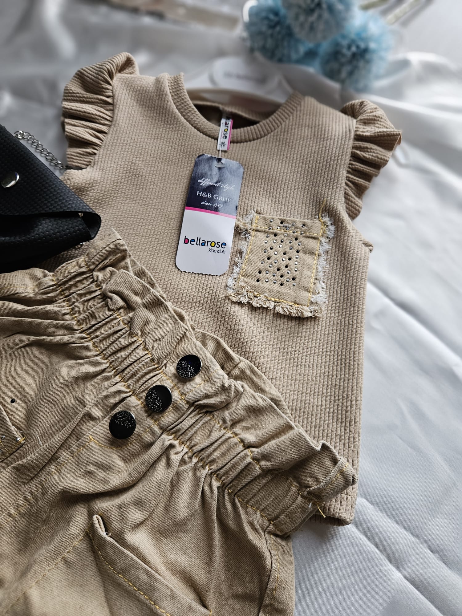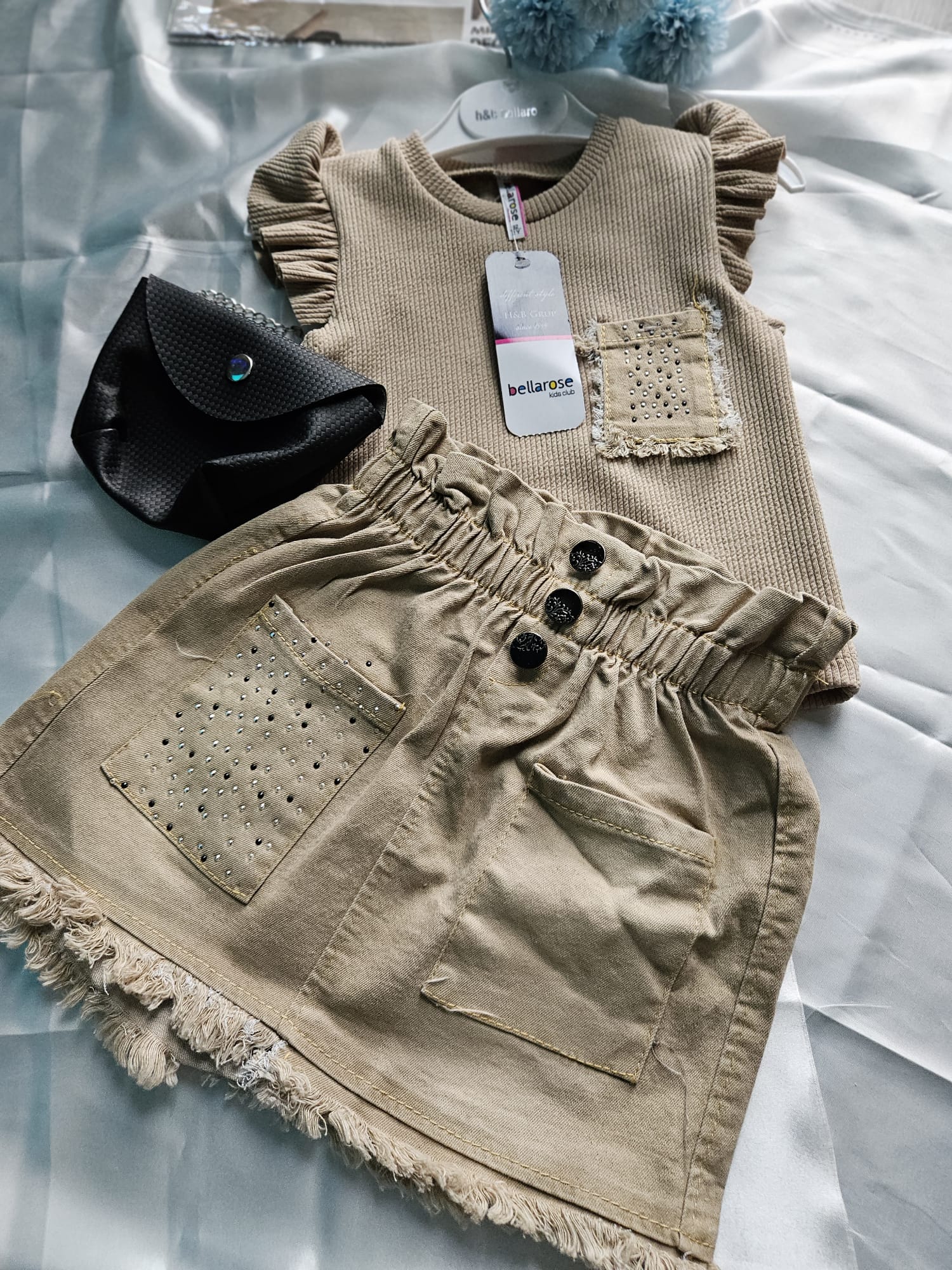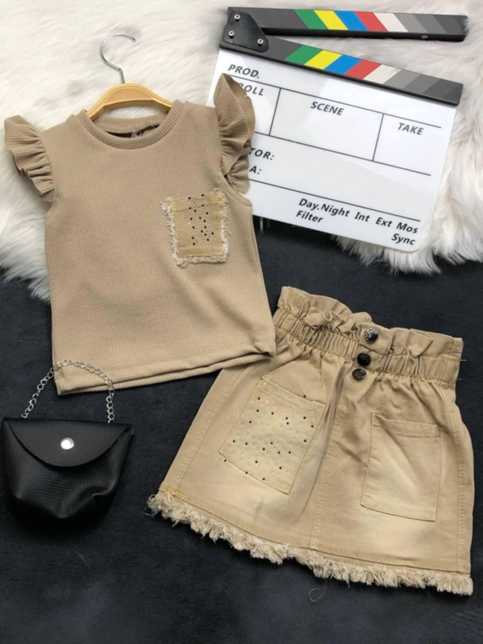 Stylowy komplet dla dziewczynki w modnym, beżowym kolorze: elegancka bluzka w połączeniu ze spódniczką oraz uroczą torebką w zestawie. Delikatne materiały i dopracowany fason zapewniają komfort noszenia i swobodę ruchów. Idealny wybór na wyjątkowe okazje – subtelna elegancja w dziecięcym wydaniu.