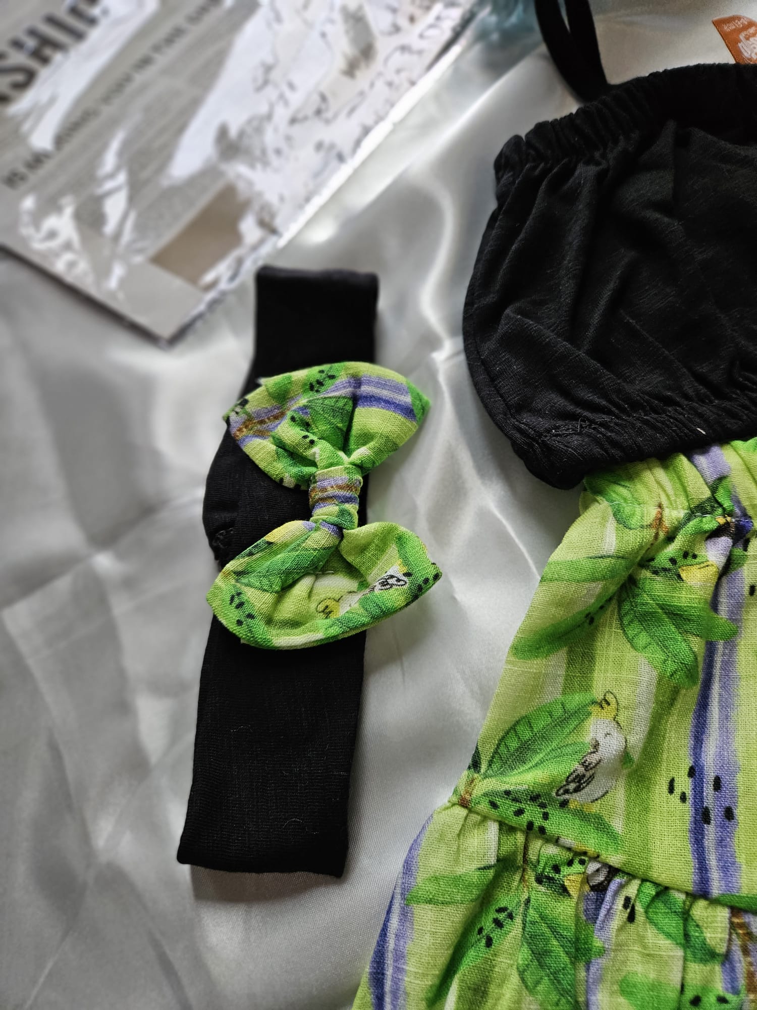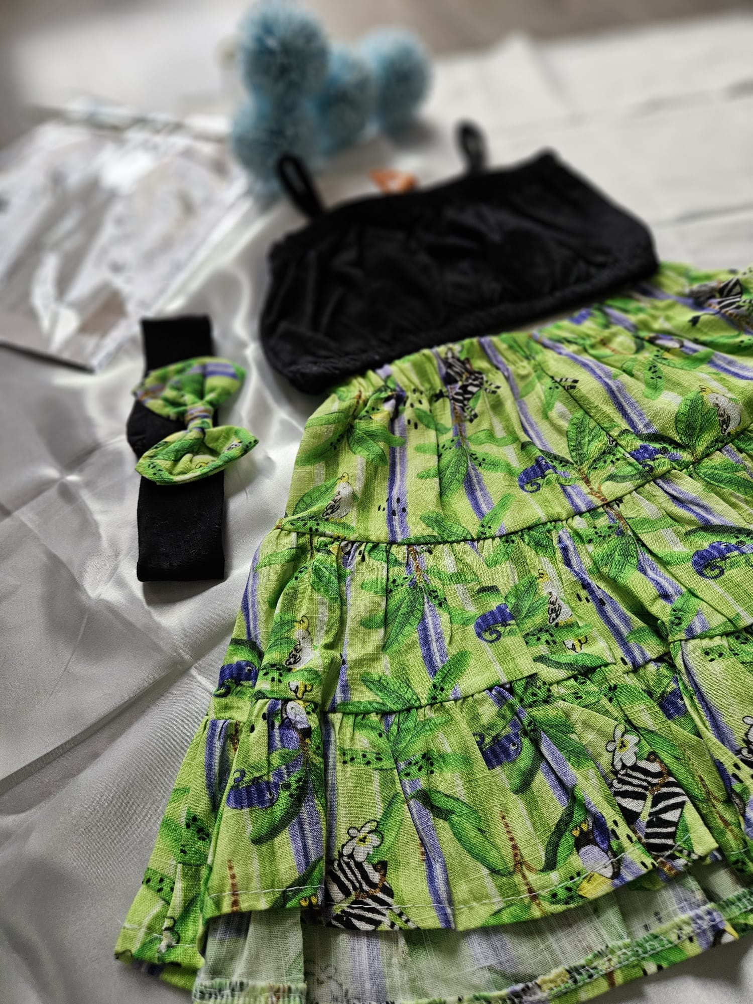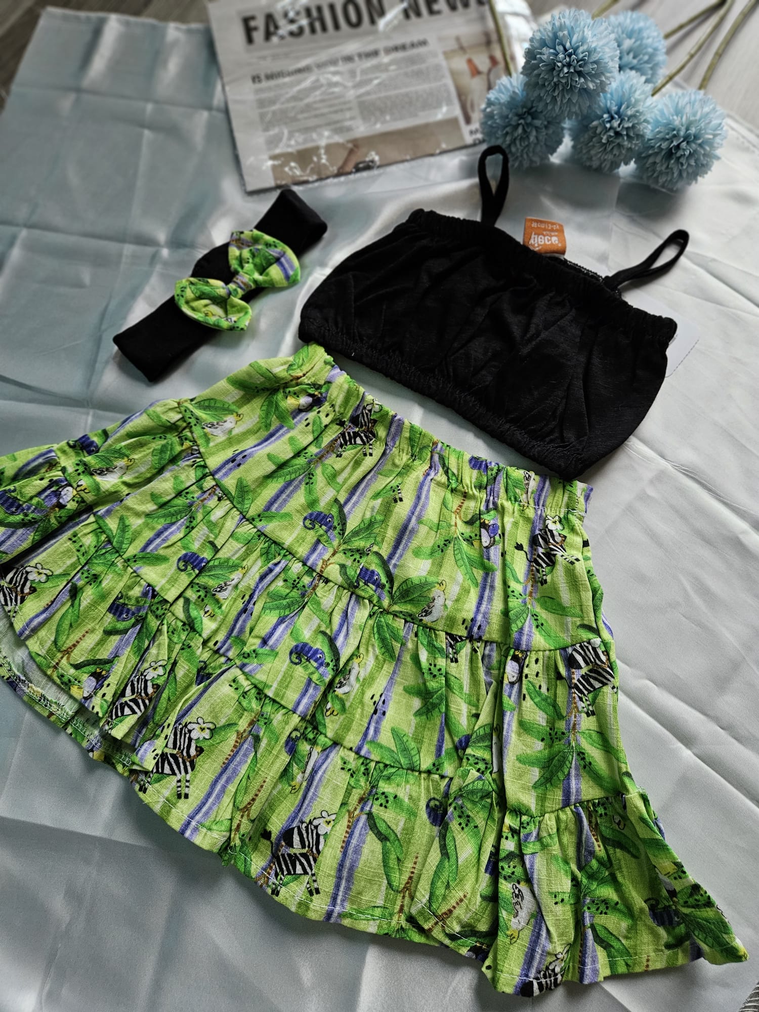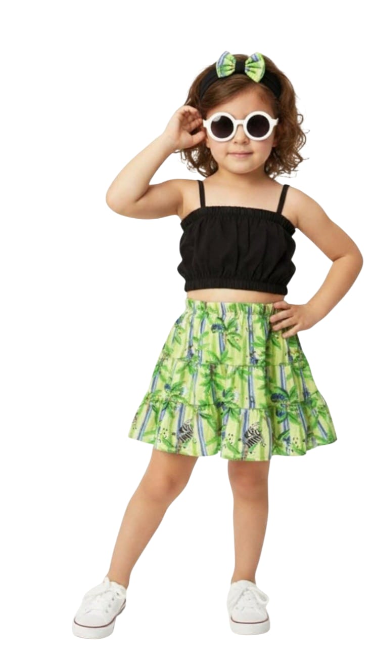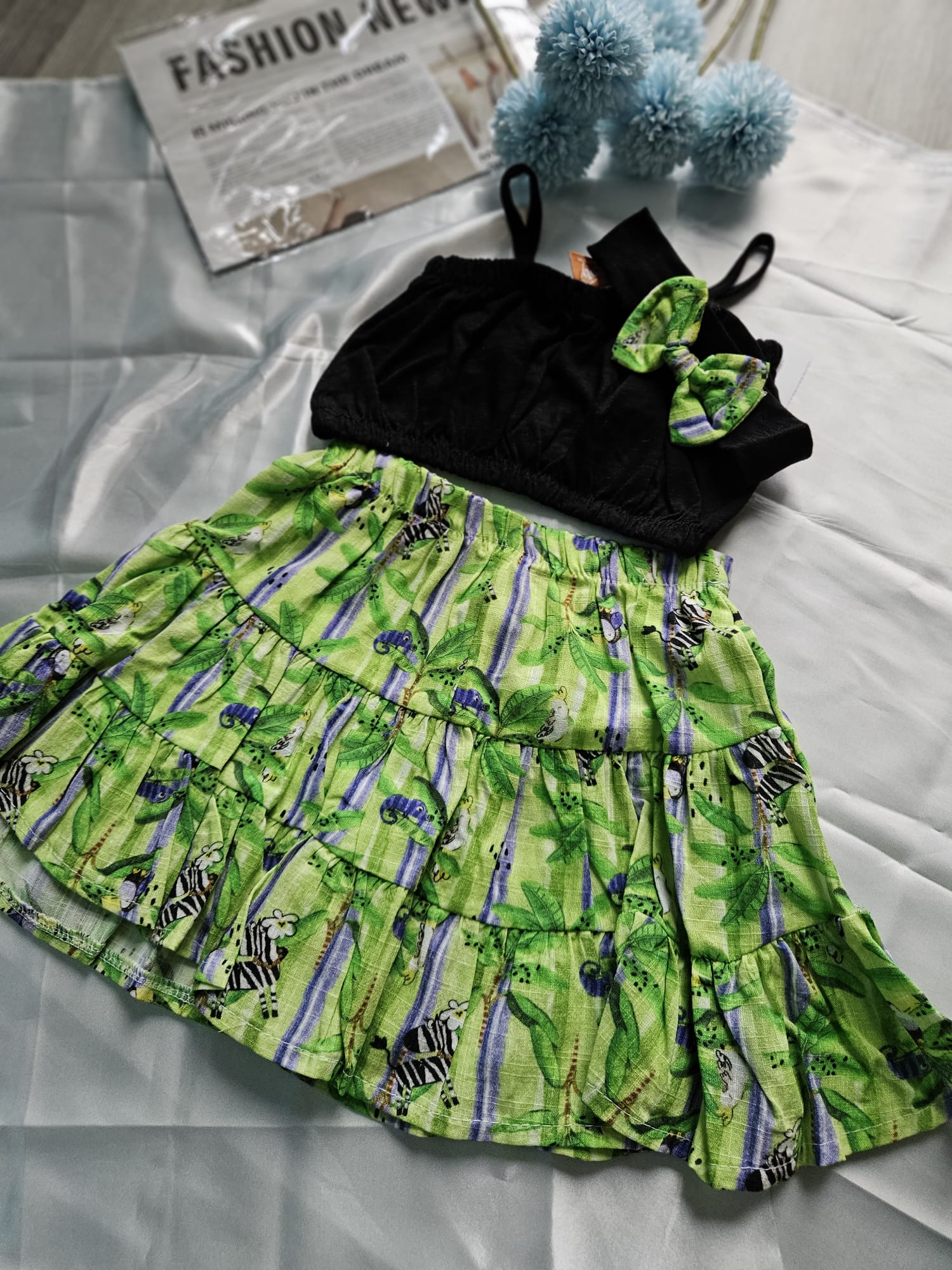 Stylowy zestaw dla małych miłośniczek przyrody! Czarny top w połączeniu z zieloną spódniczką ozdobioną wesołymi zwierzątkami sprawi, że każda dziewczynka poczuje się wyjątkowo i gotowa na zabawę.