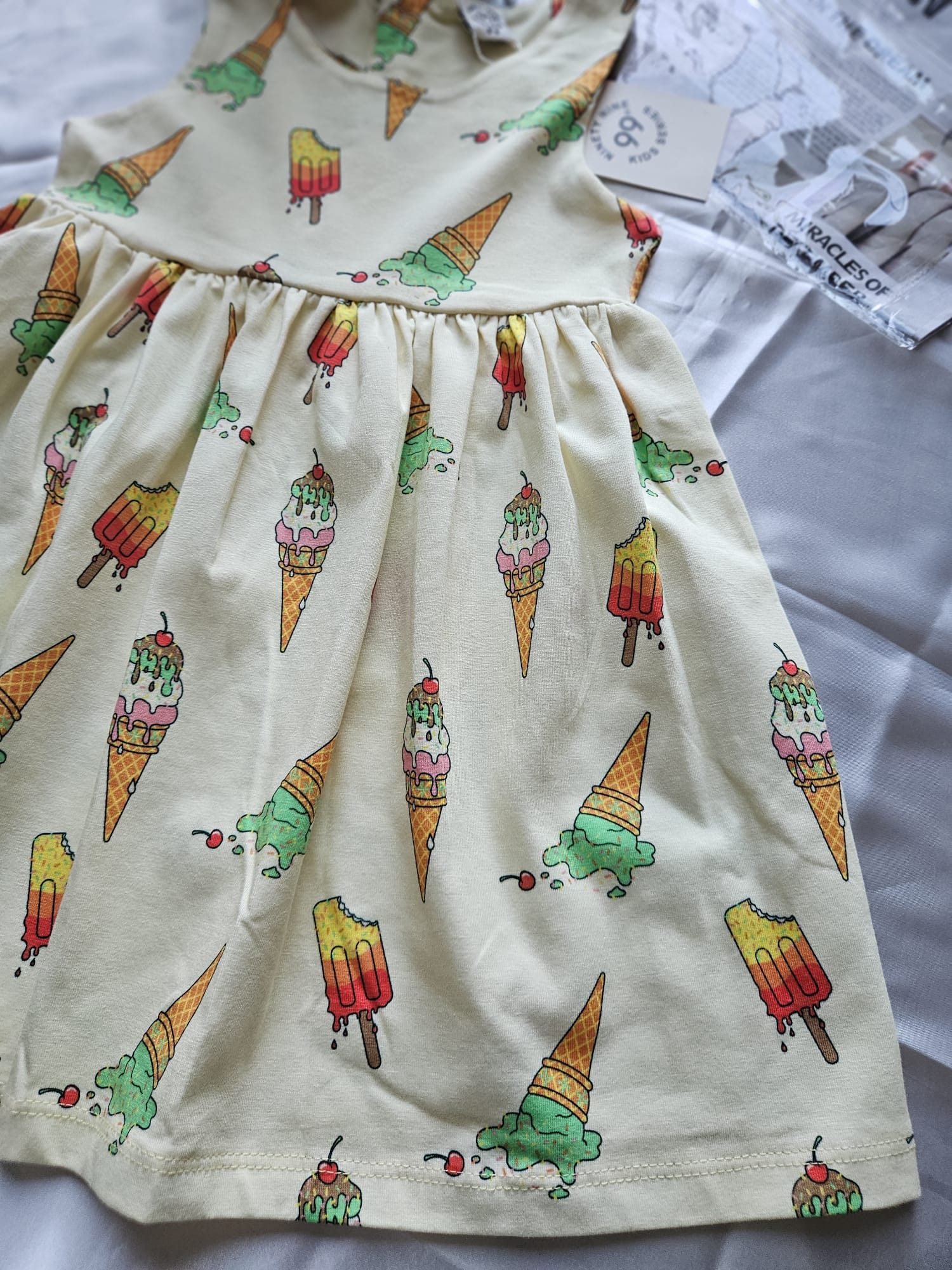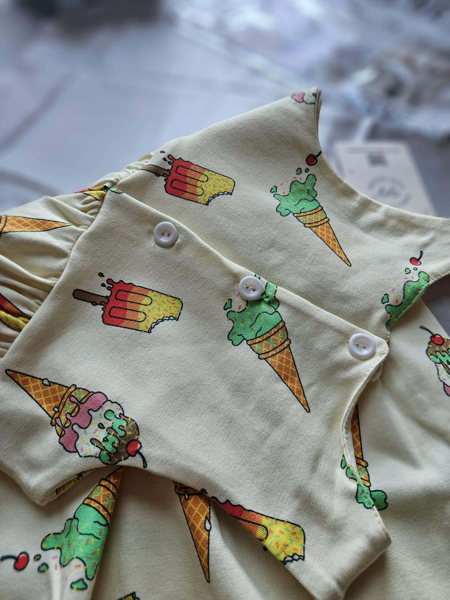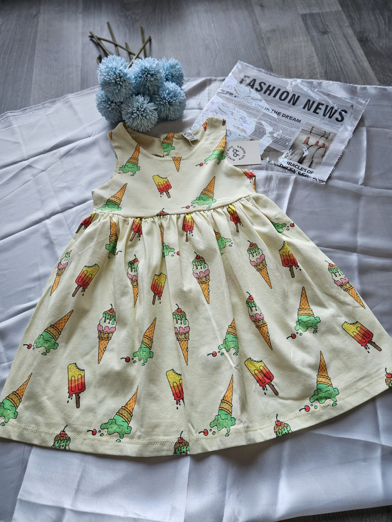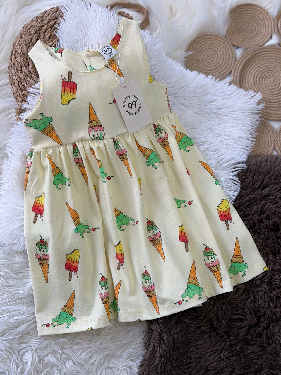 Słoneczna sukienka dla dziewczynki w kolorze żółtym! Na ramiączkach, z guzikami na plecach, ozdobiona uroczymi aplikacjami lodów – idealna na letnie dni pełne zabawy i radości.
