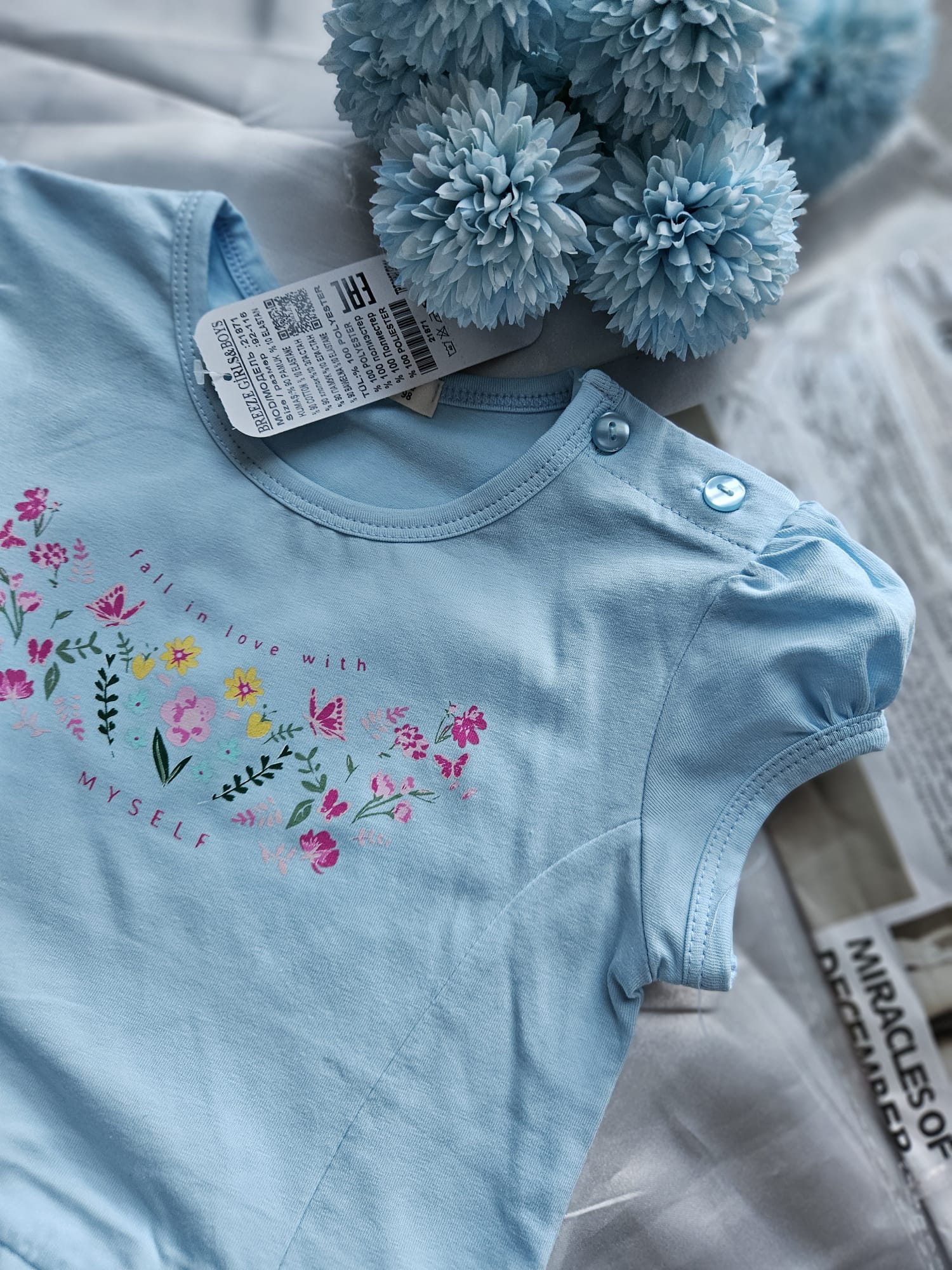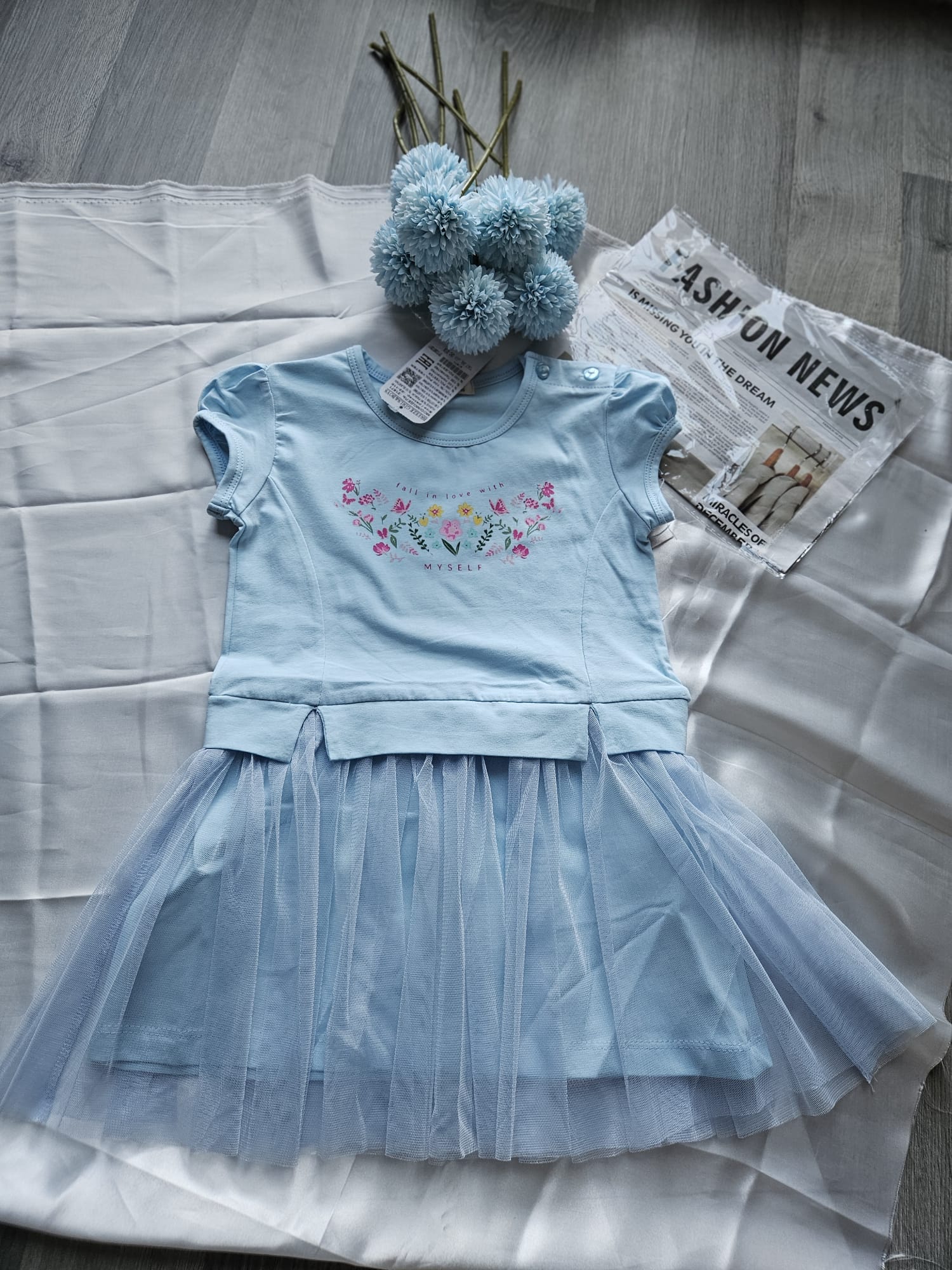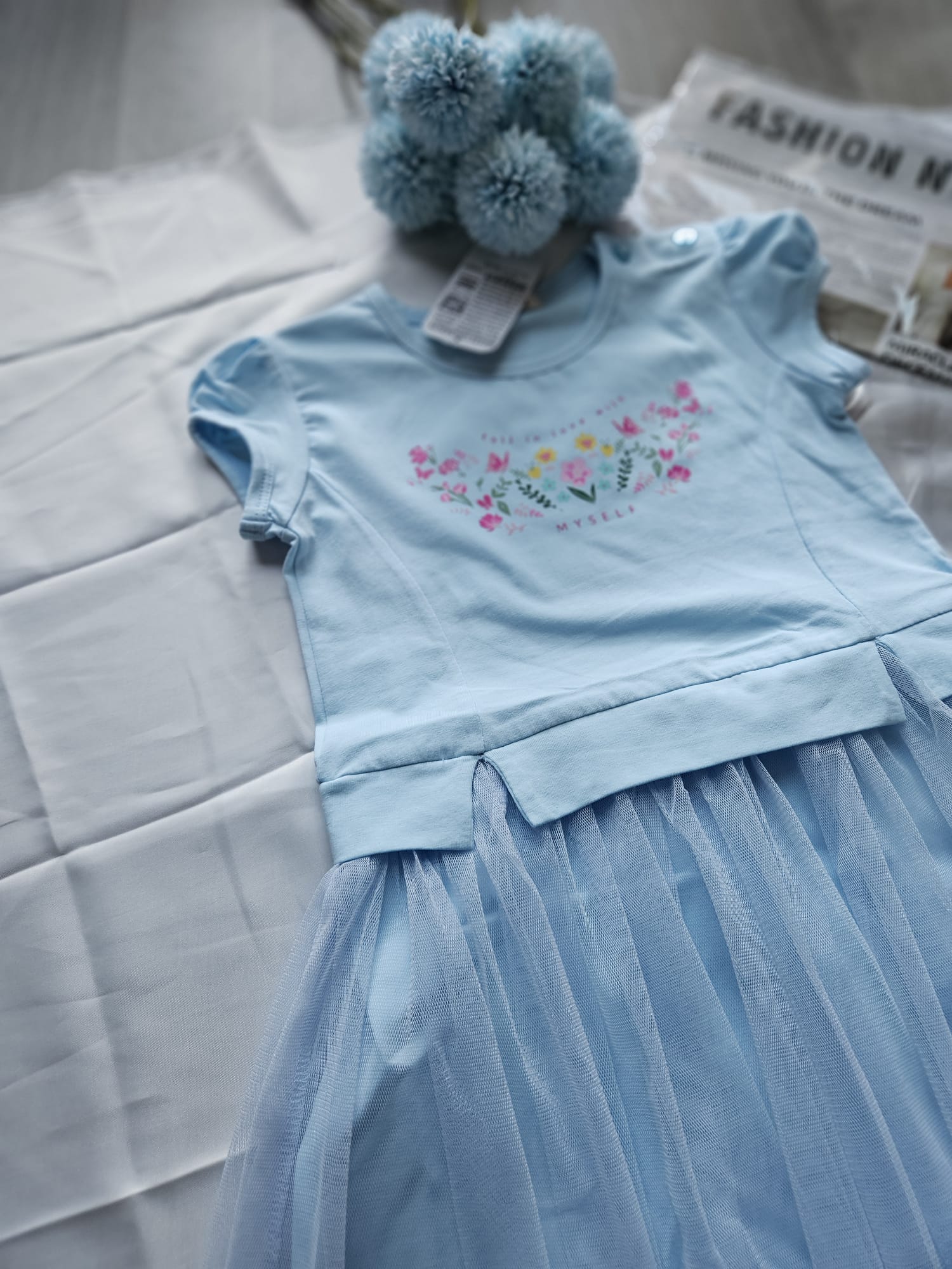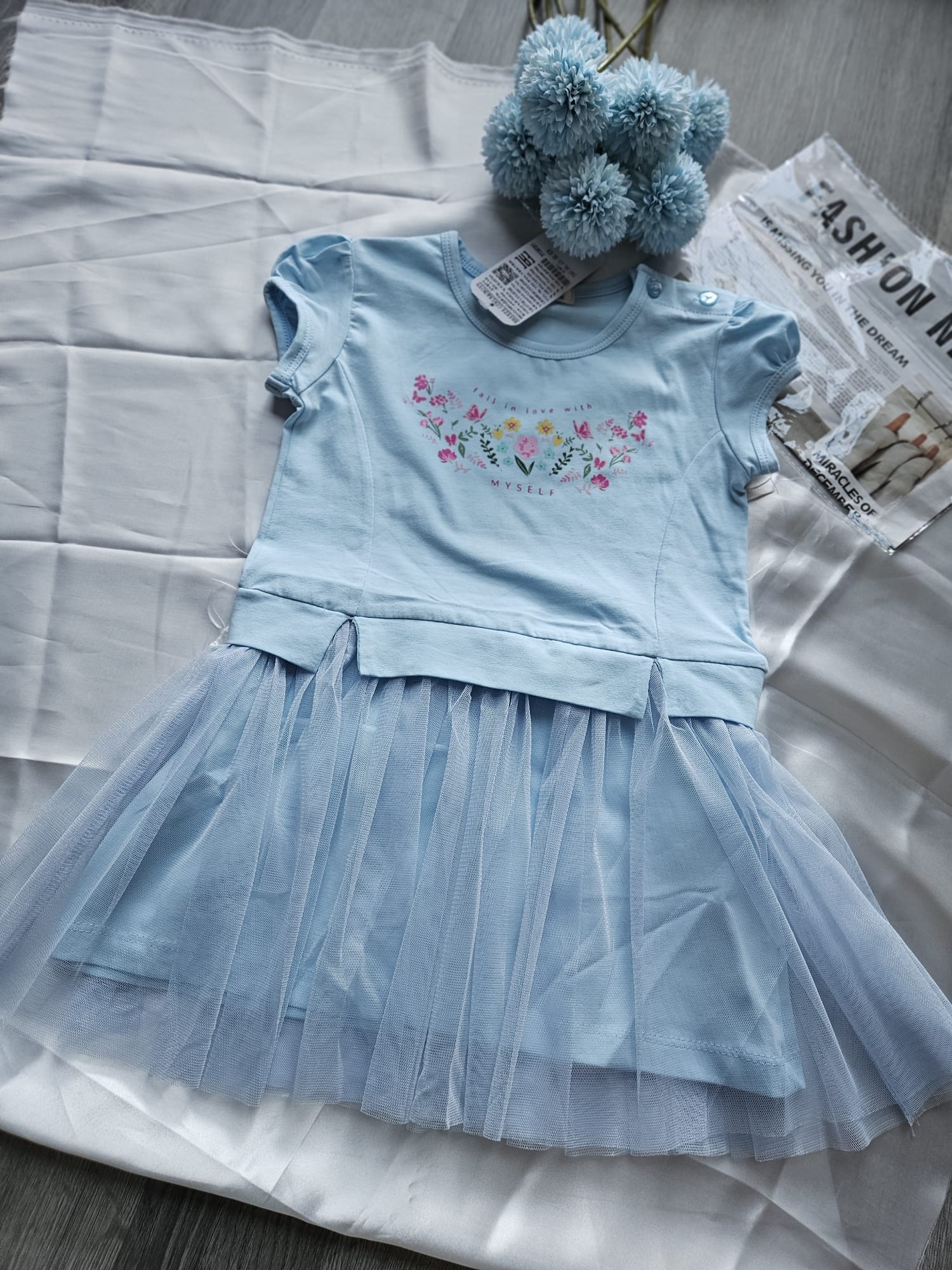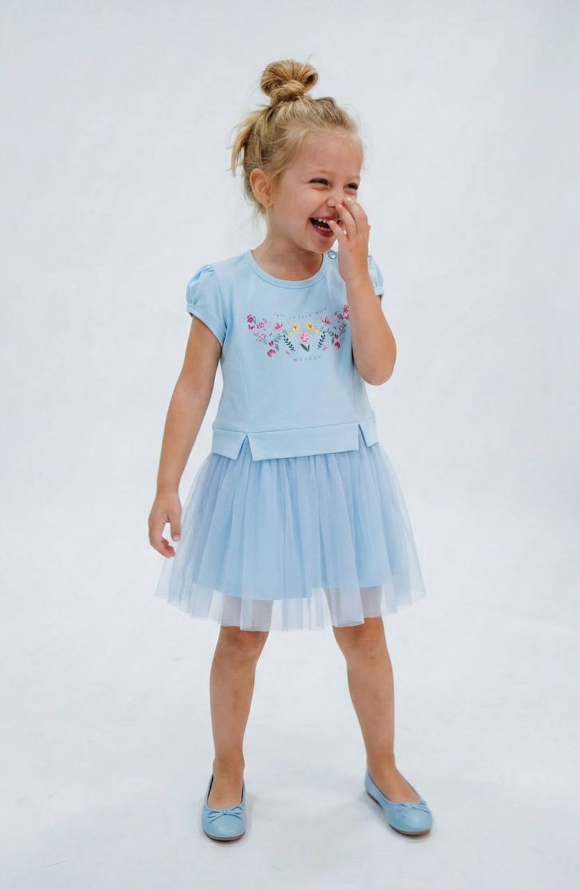 Urocza niebieska sukienka dla dziewczynki! Krótki rękaw i dół zdobiony tiulem dodają lekkości i dziewczęcego uroku, a praktyczne guziki na ramieniu ułatwiają zakładanie i zdejmowanie.