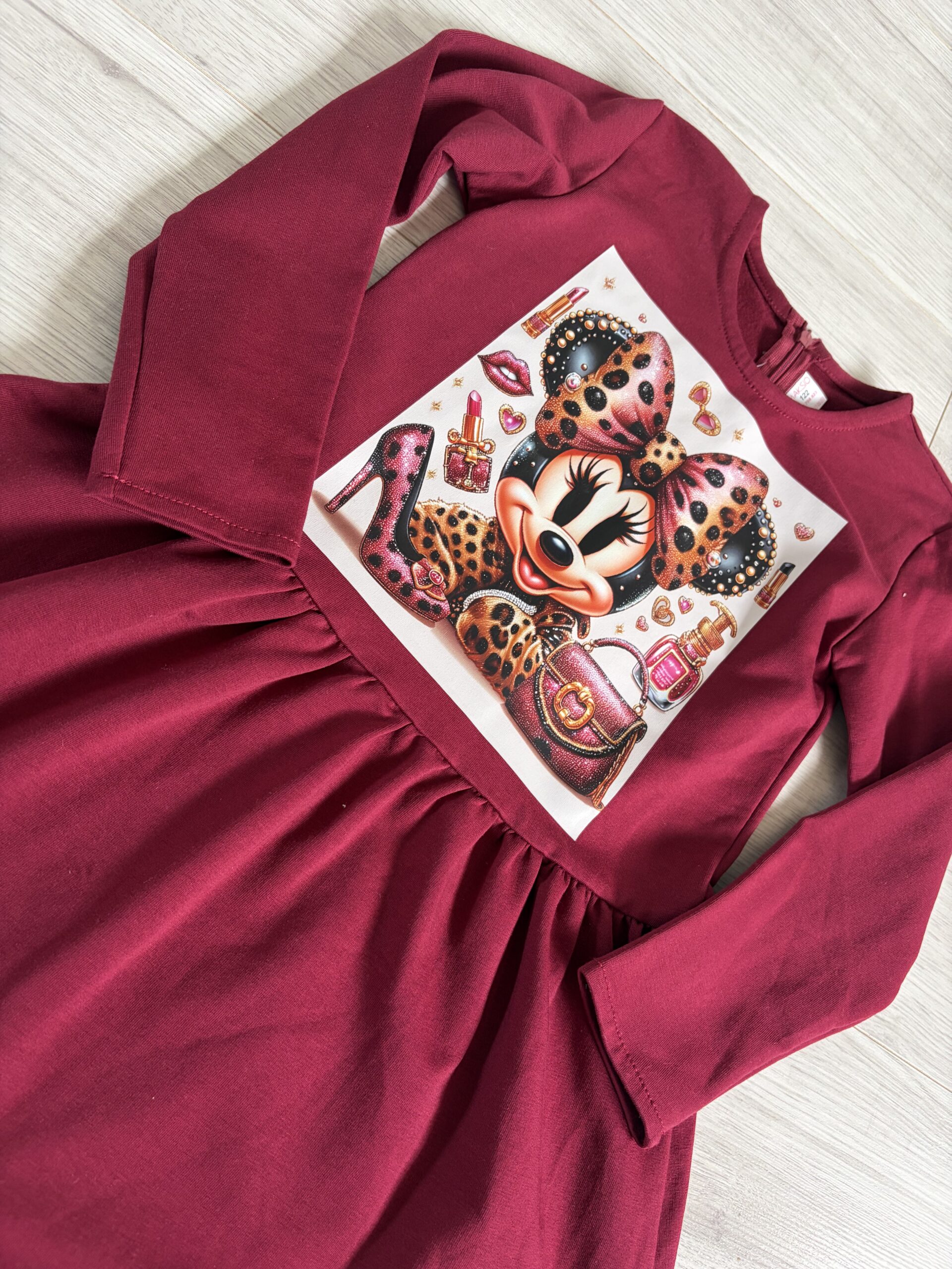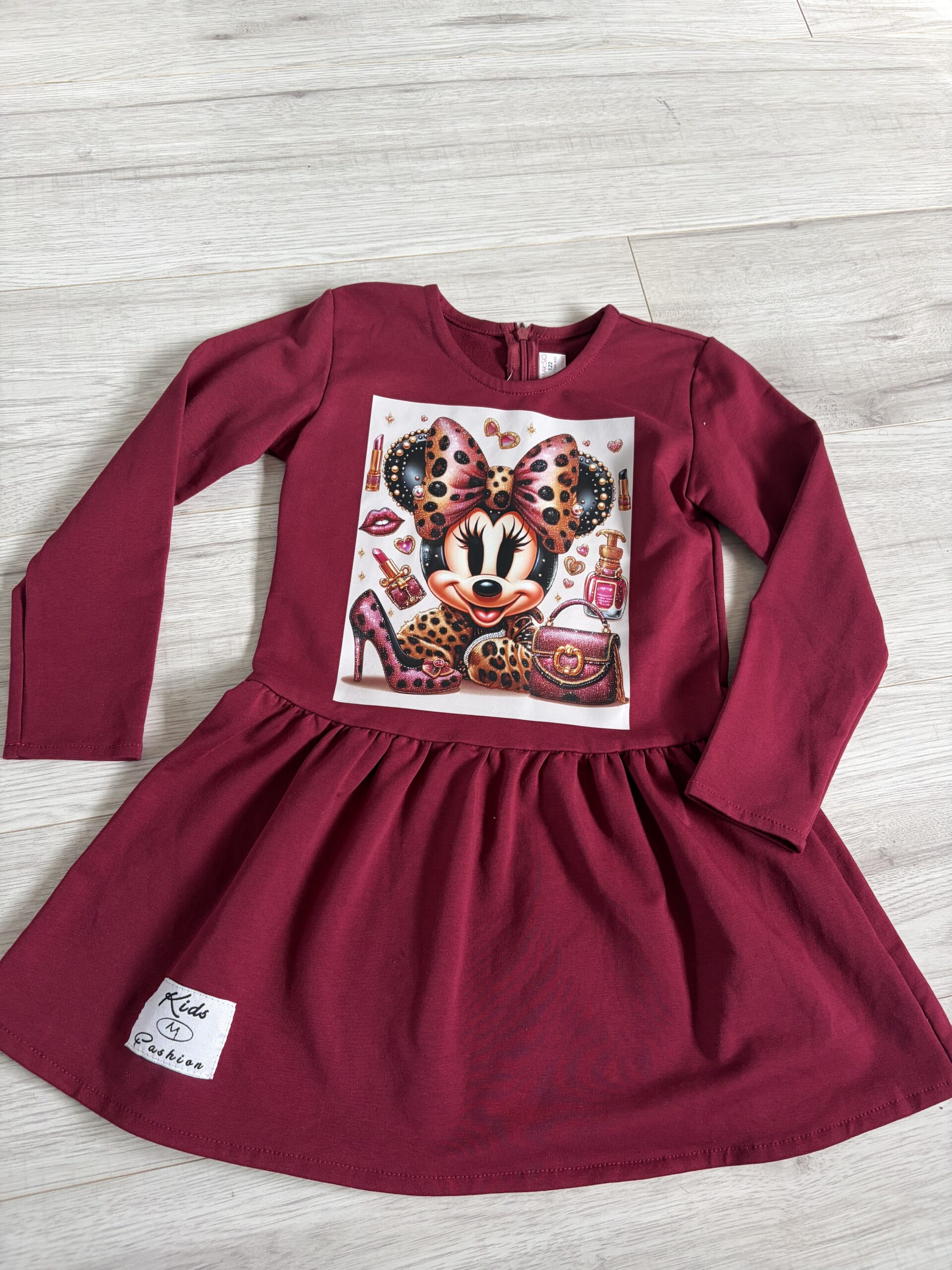 Piękna sukienka w kolorze bordowym ! Z tyłu zapinana na zamek . Piękna aplikacja myszki dodaje dużo uroku >