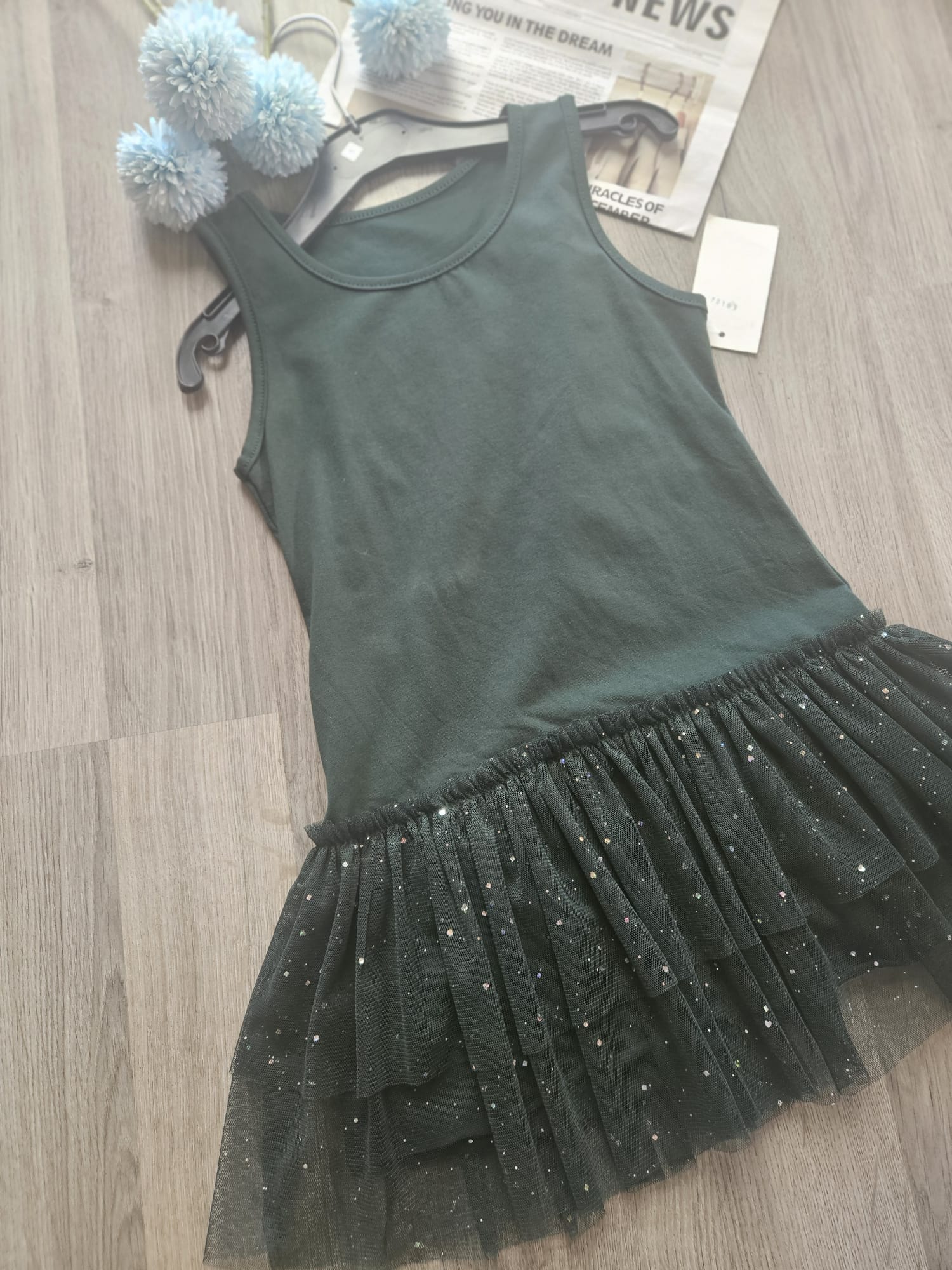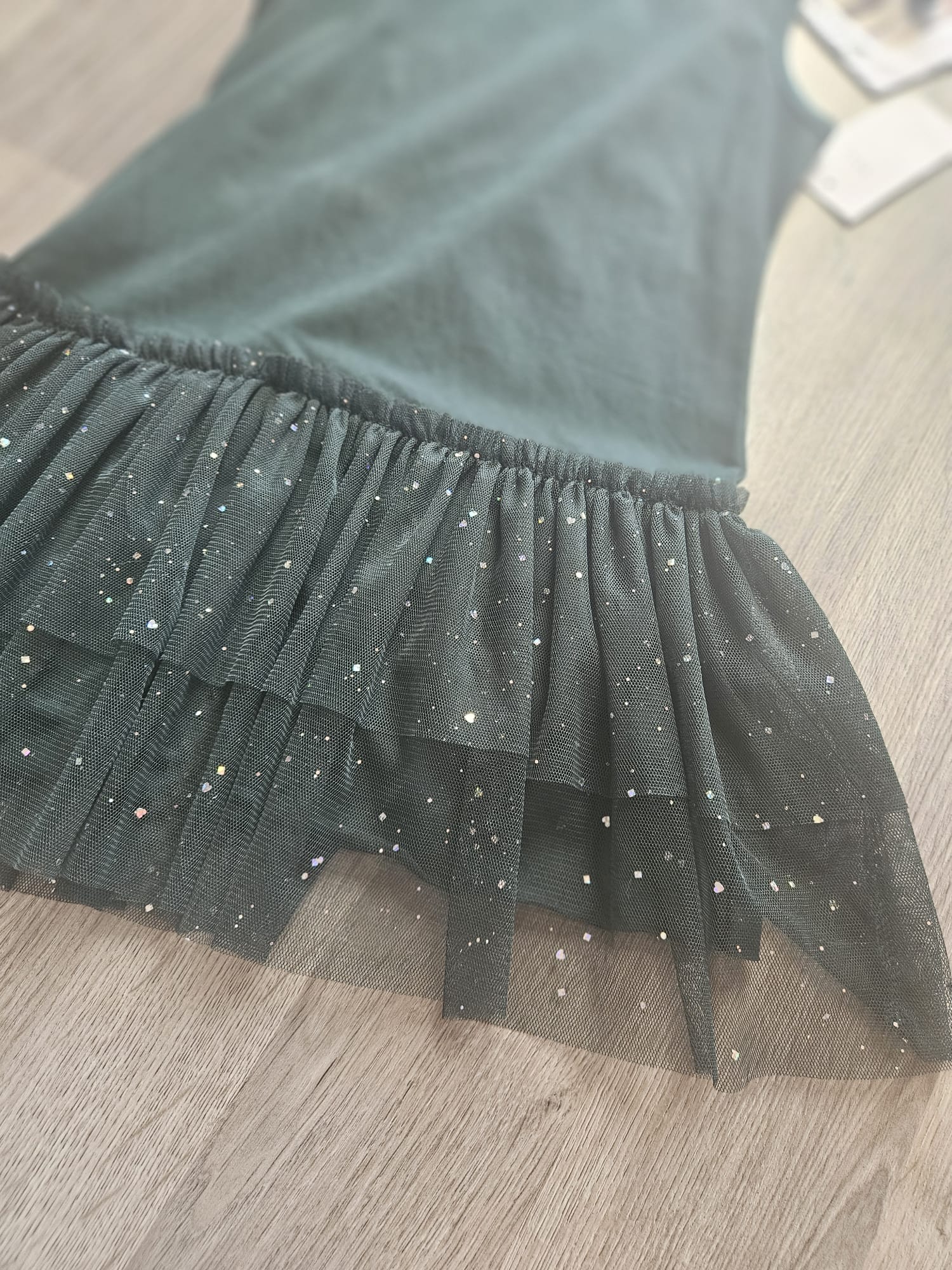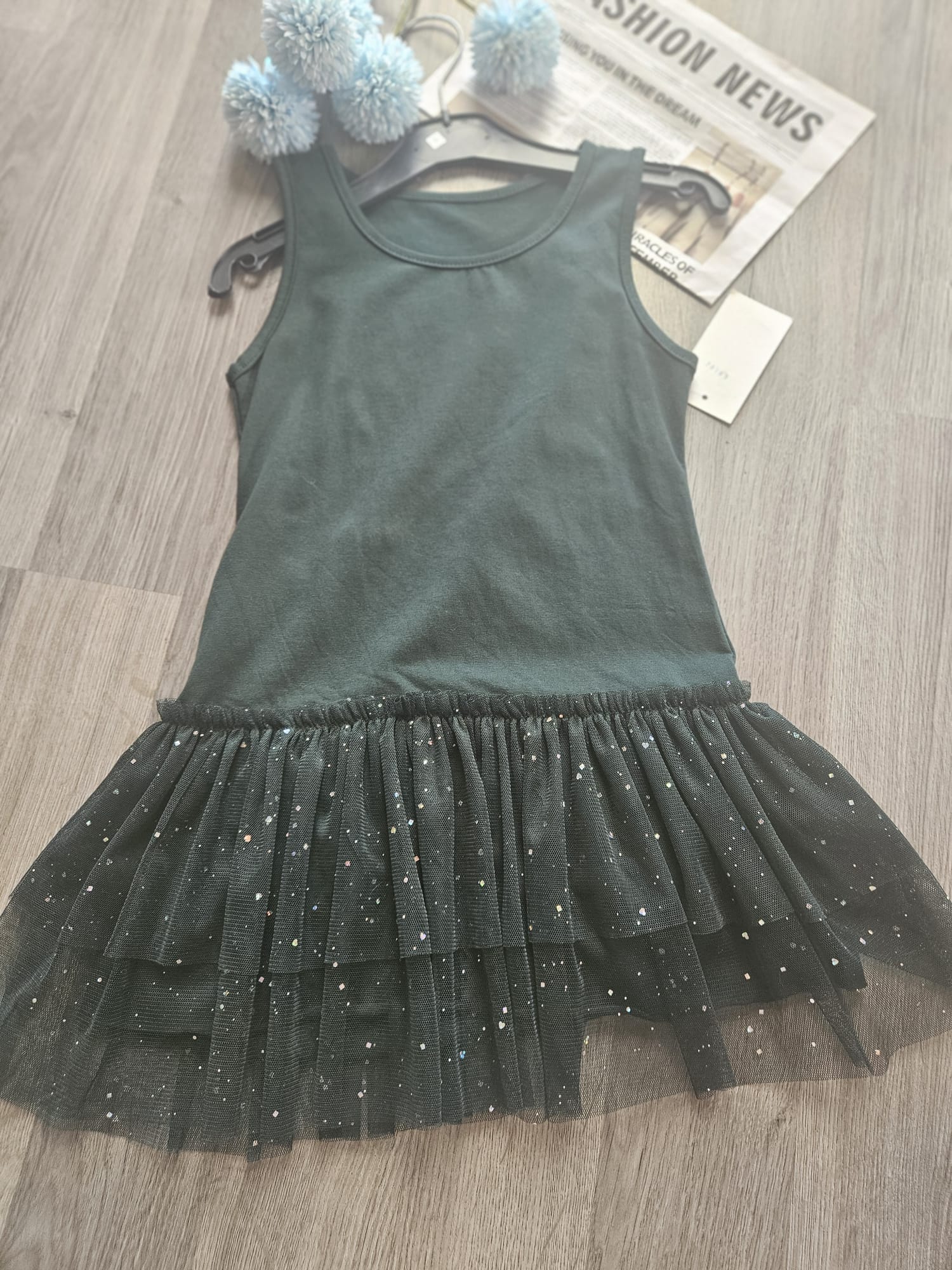 Elegancka sukienka na ramiączkach dla dziewczynki w głębokim odcieniu zieleni. Dół sukienki wykonany z tiulu ozdobionego subtelnym, błyszczącym pyłkiem, który dodaje całości wyjątkowego uroku. Idealna na specjalne okazje i małe przyjęcia.