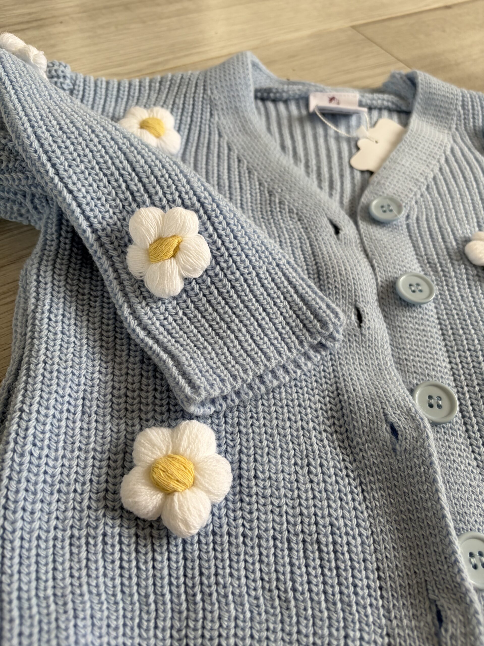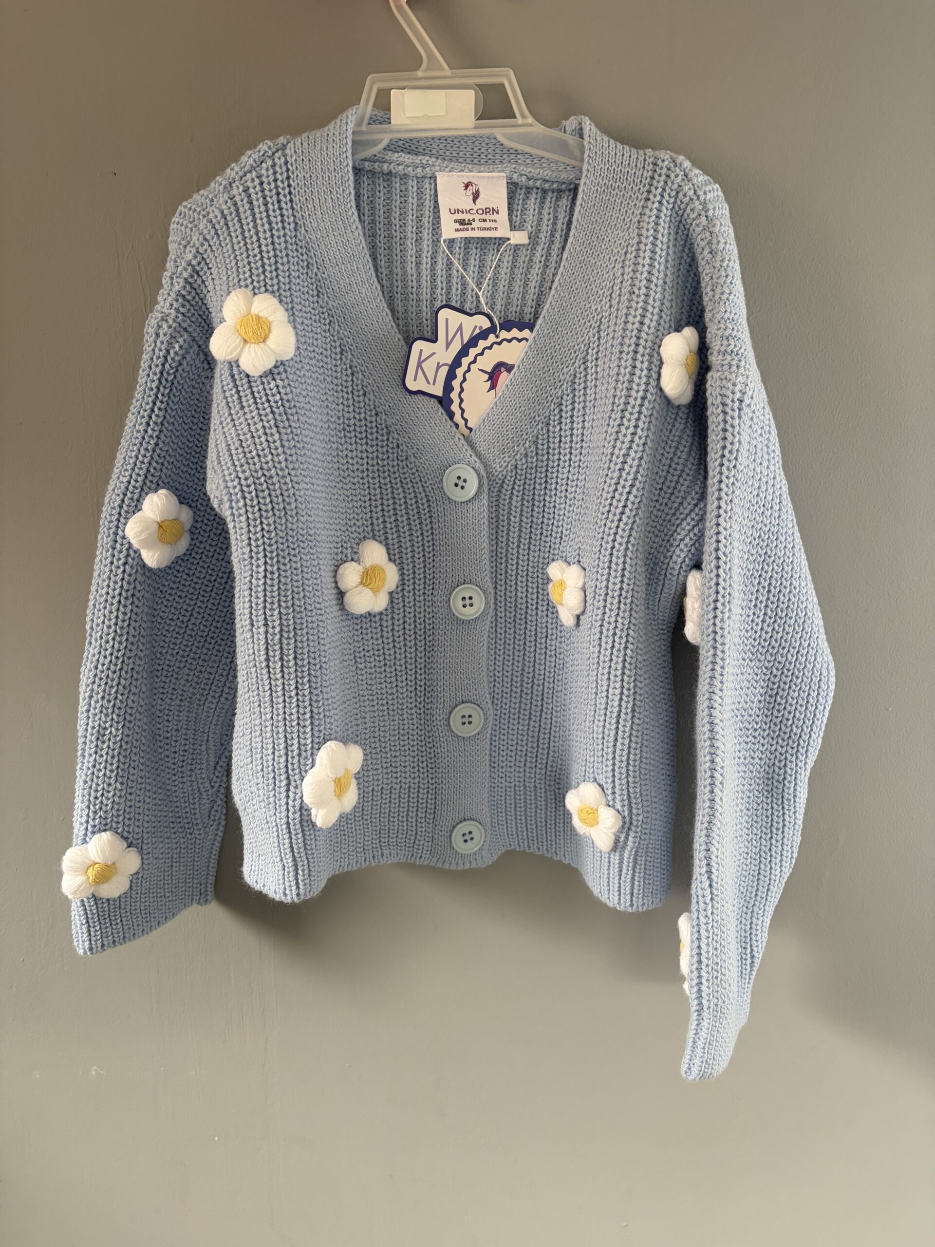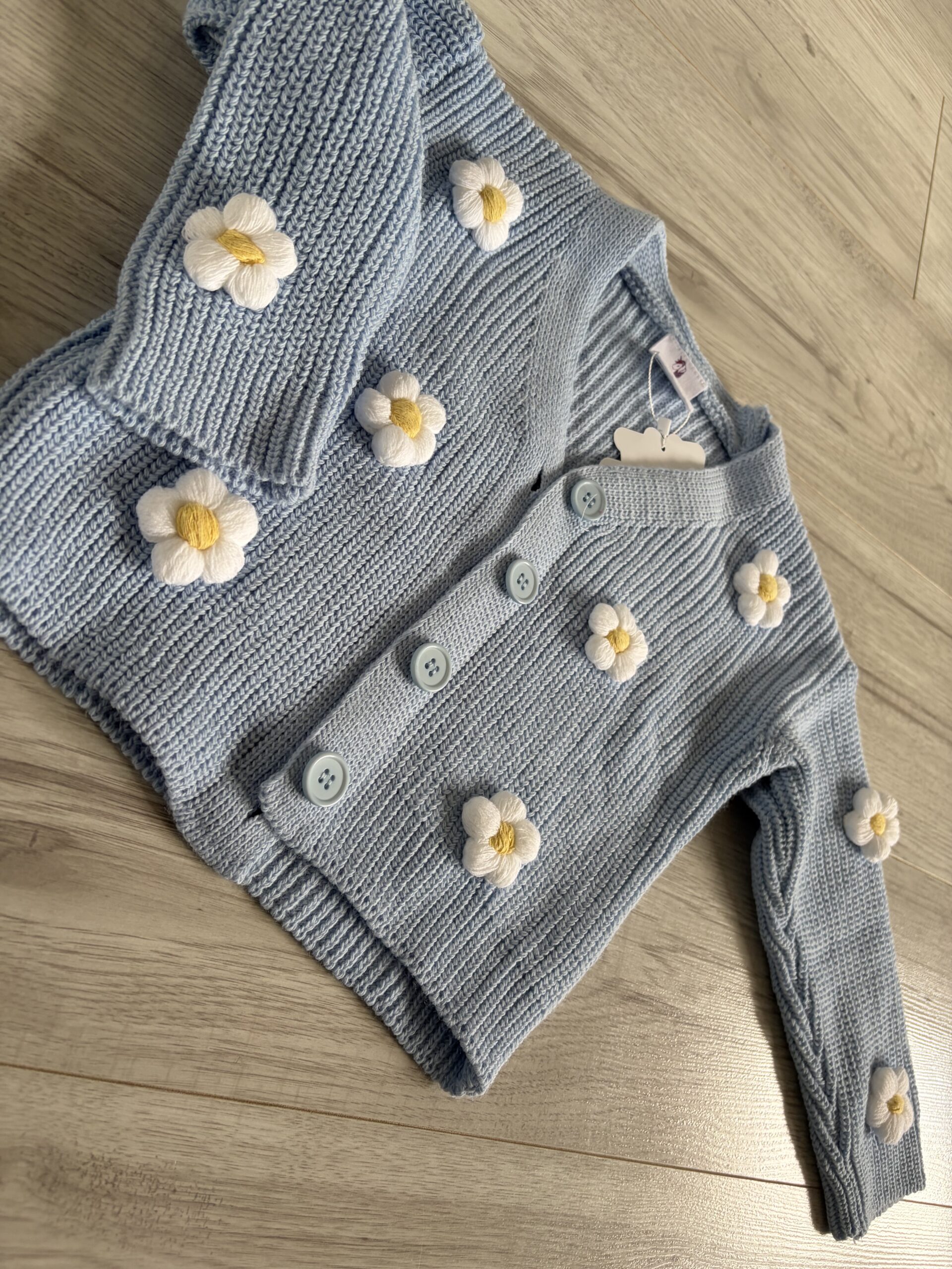 Totalny sztos !!! Piękny sweterek w kolorze błękitnym z kwiatkami 3D . Zapinany na guziki.