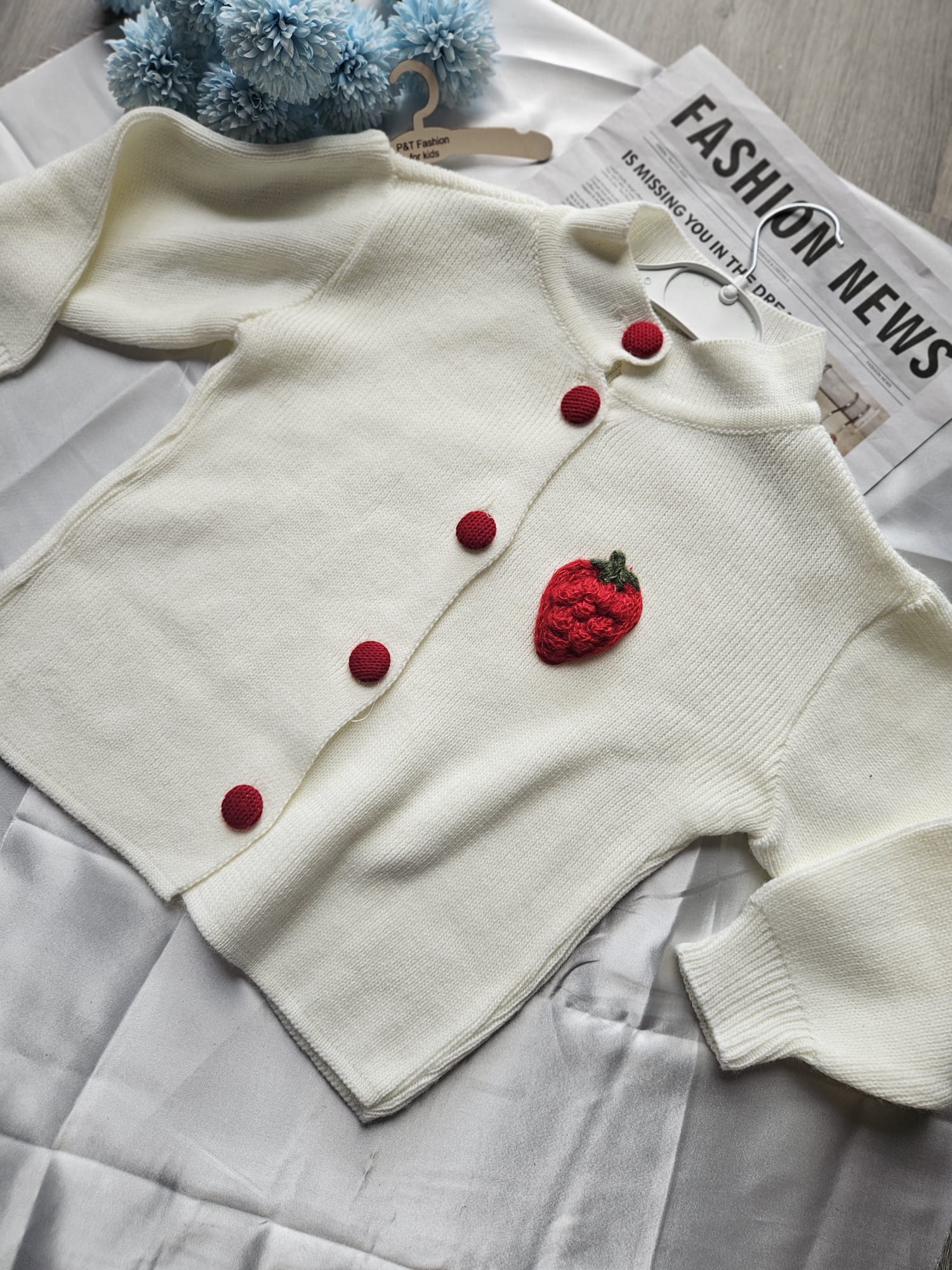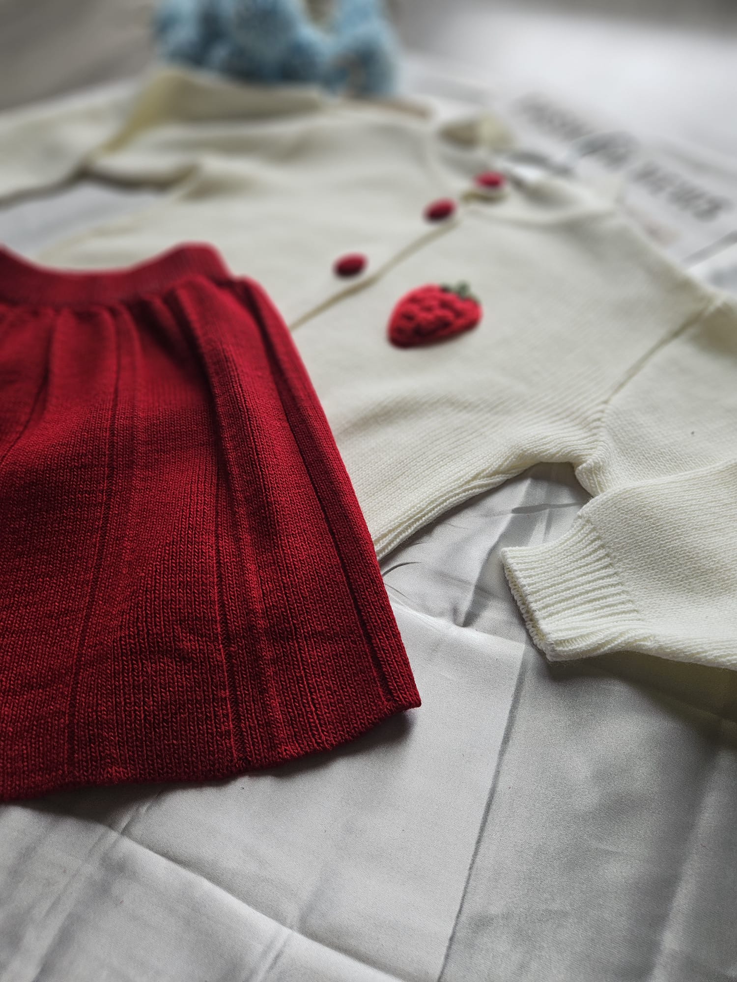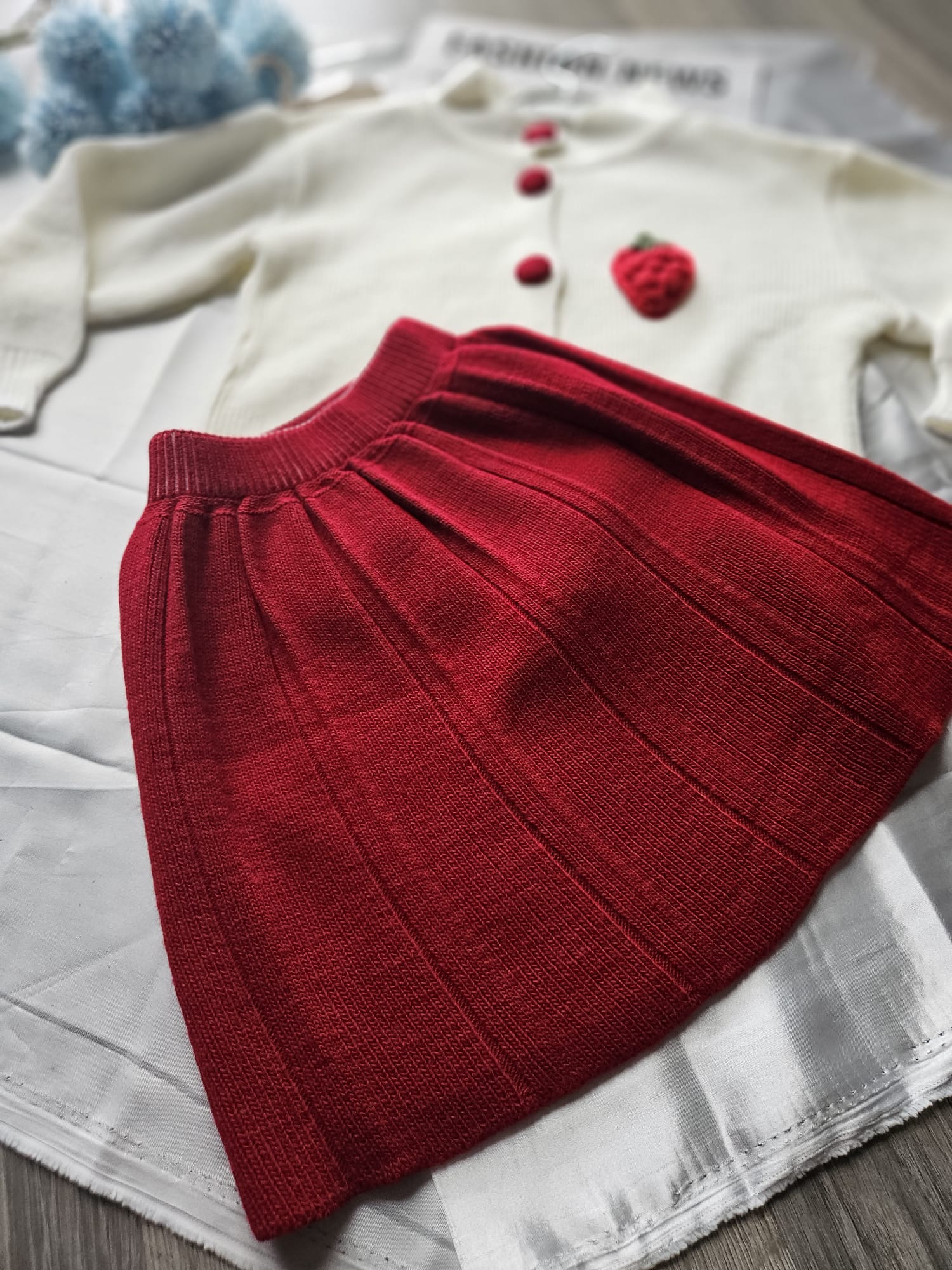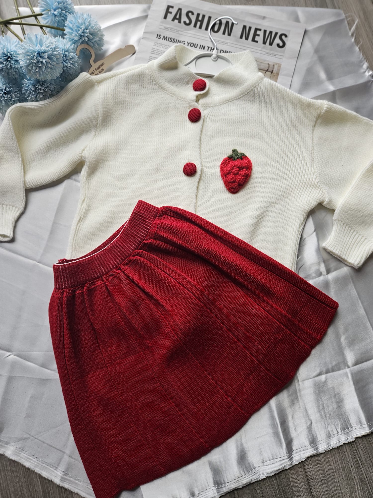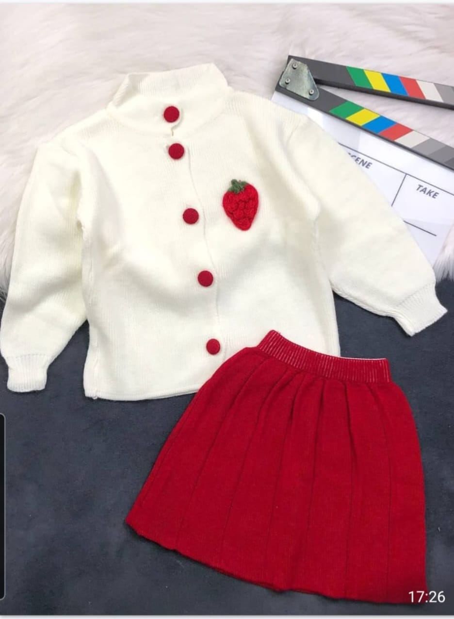 Uroczy komplet dla dziewczynki składający się z czerwonej sukienki i białego sweterka z aplikacją truskawki. Miękki, przyjemny w dotyku materiał zapewnia komfort noszenia, a słodki motyw dodaje całości dziewczęcego uroku. Idealny zestaw na codzienne zabawy i rodzinne wyjścia. 🍓❤️