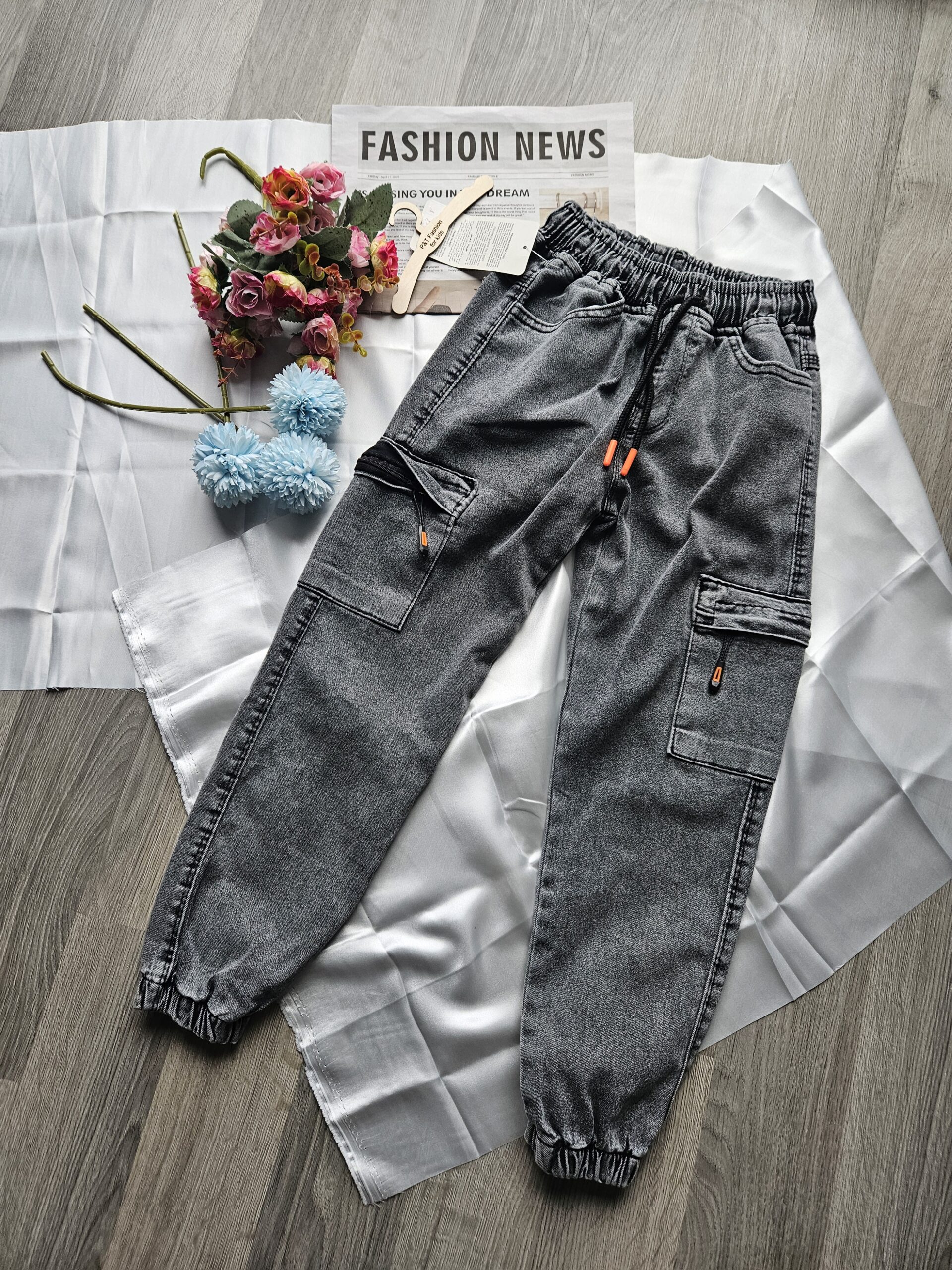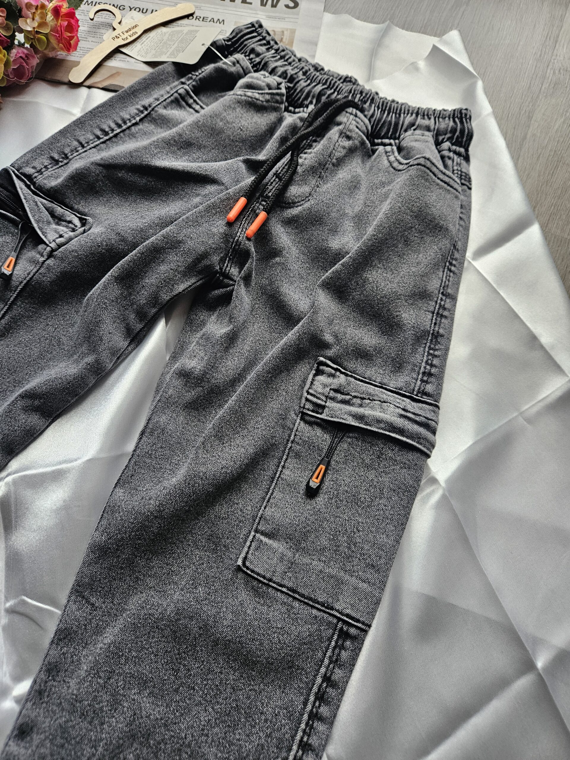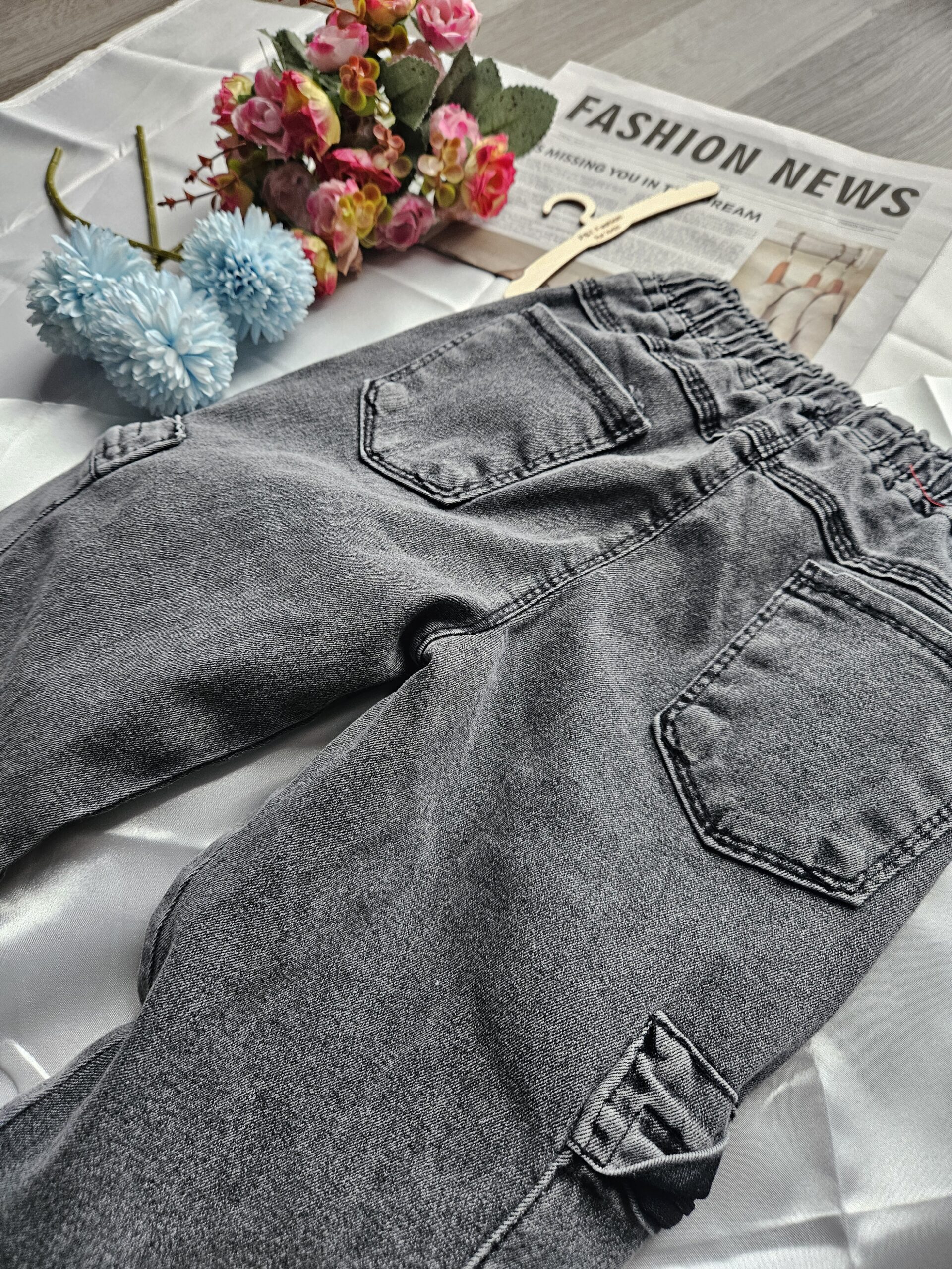 Wygodne szare spodnie chłopięce wykonane z miękkiego materiału typu soft jeans. Dzięki elastycznej gumce w pasie i regulowanemu sznurkowi świetnie dopasowują się do sylwetki dziecka i zapewniają komfort przez cały dzień.