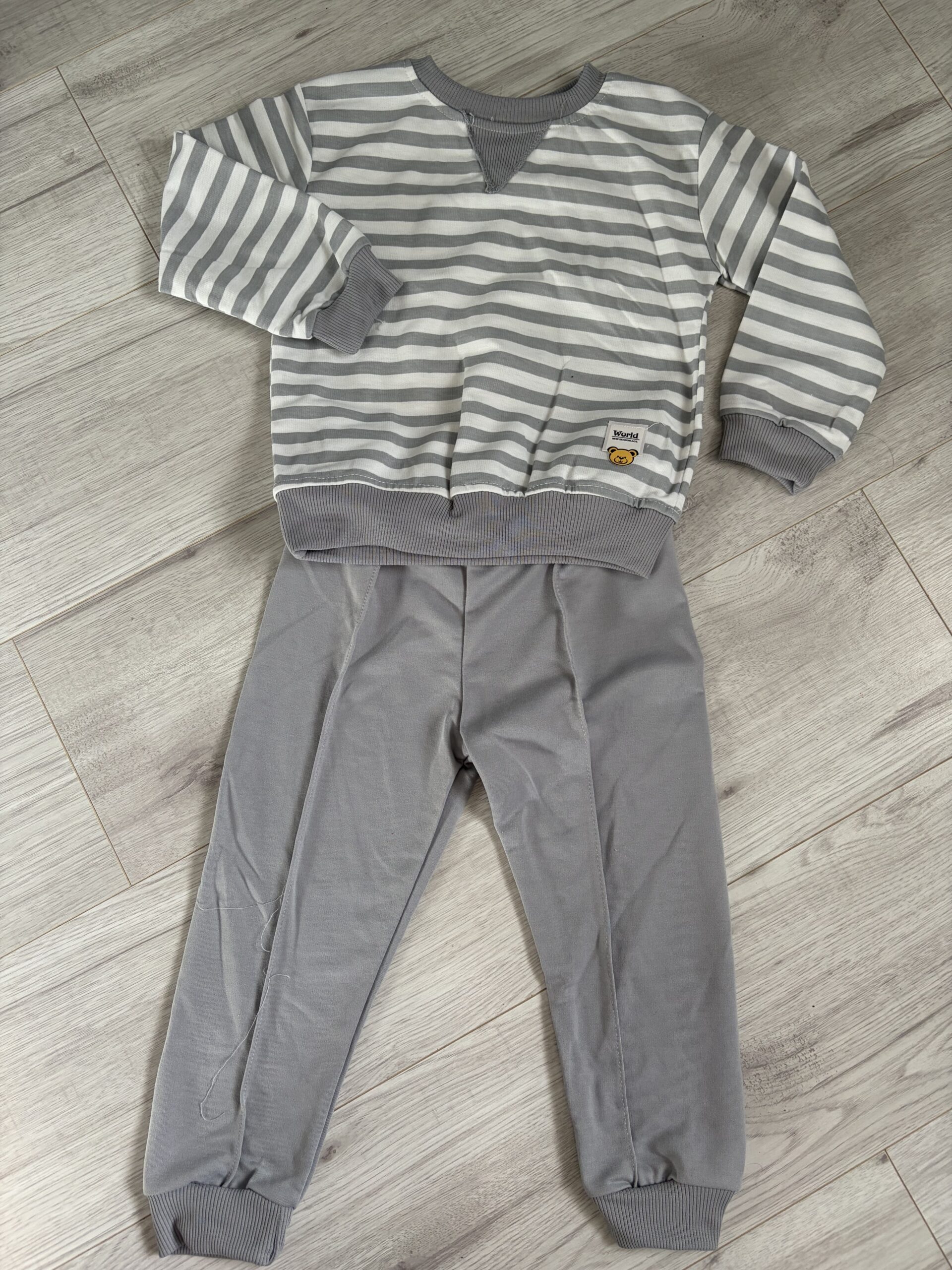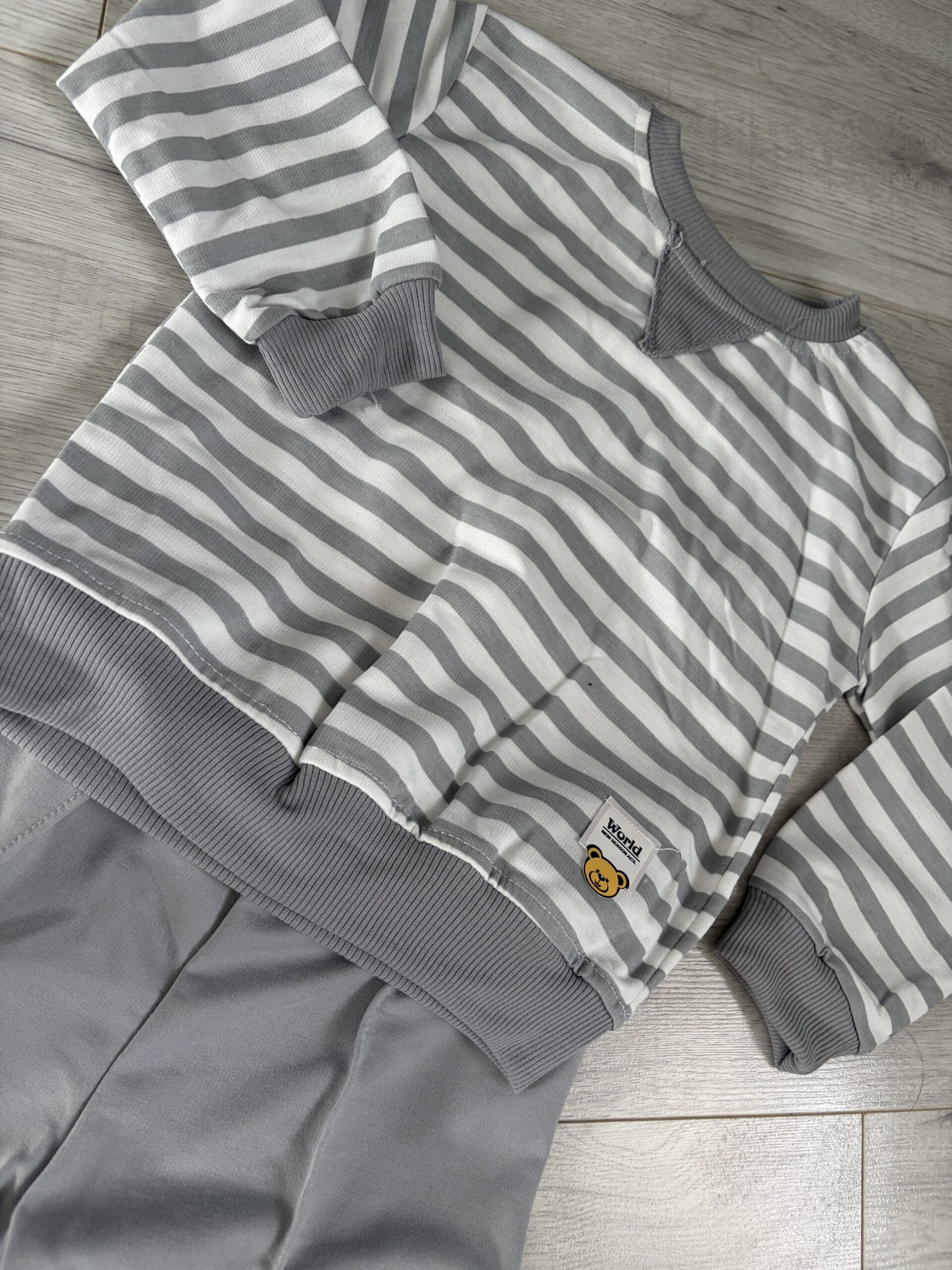 Klasyczny szary komplet dresowy dla chłopca. W zestawie znajduje się bluzka w paski oraz dopasowane, gładkie spodnie.