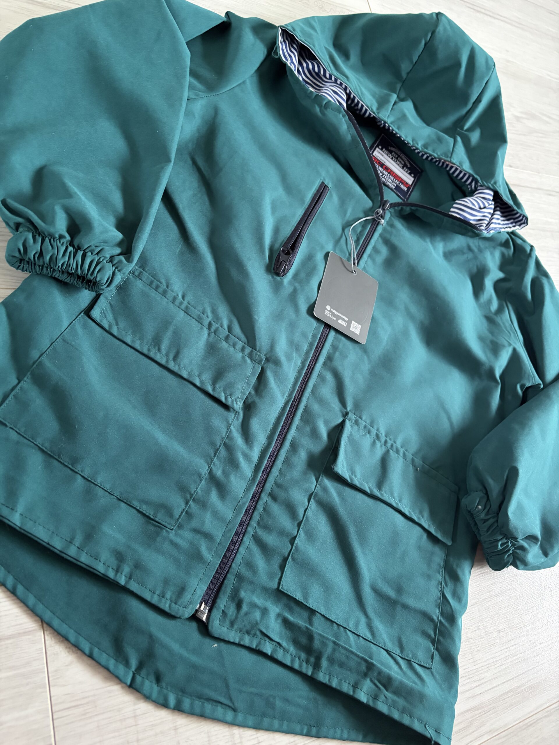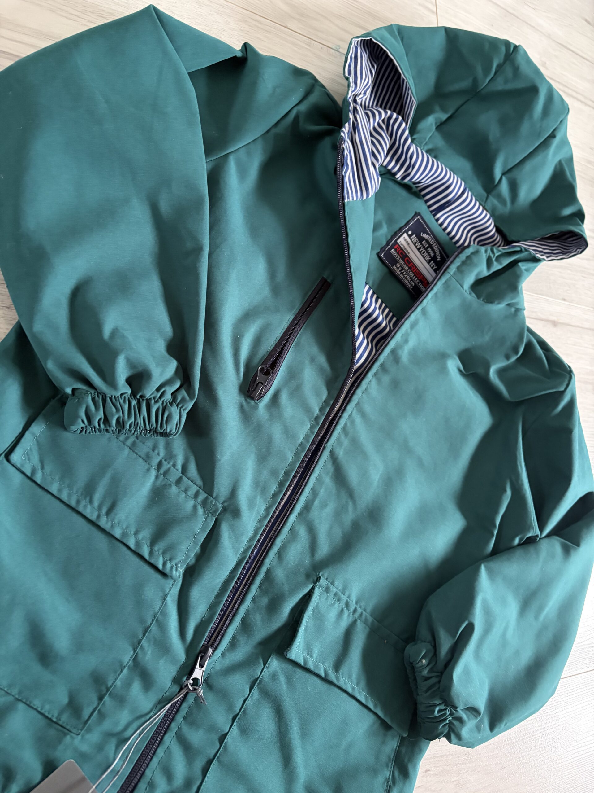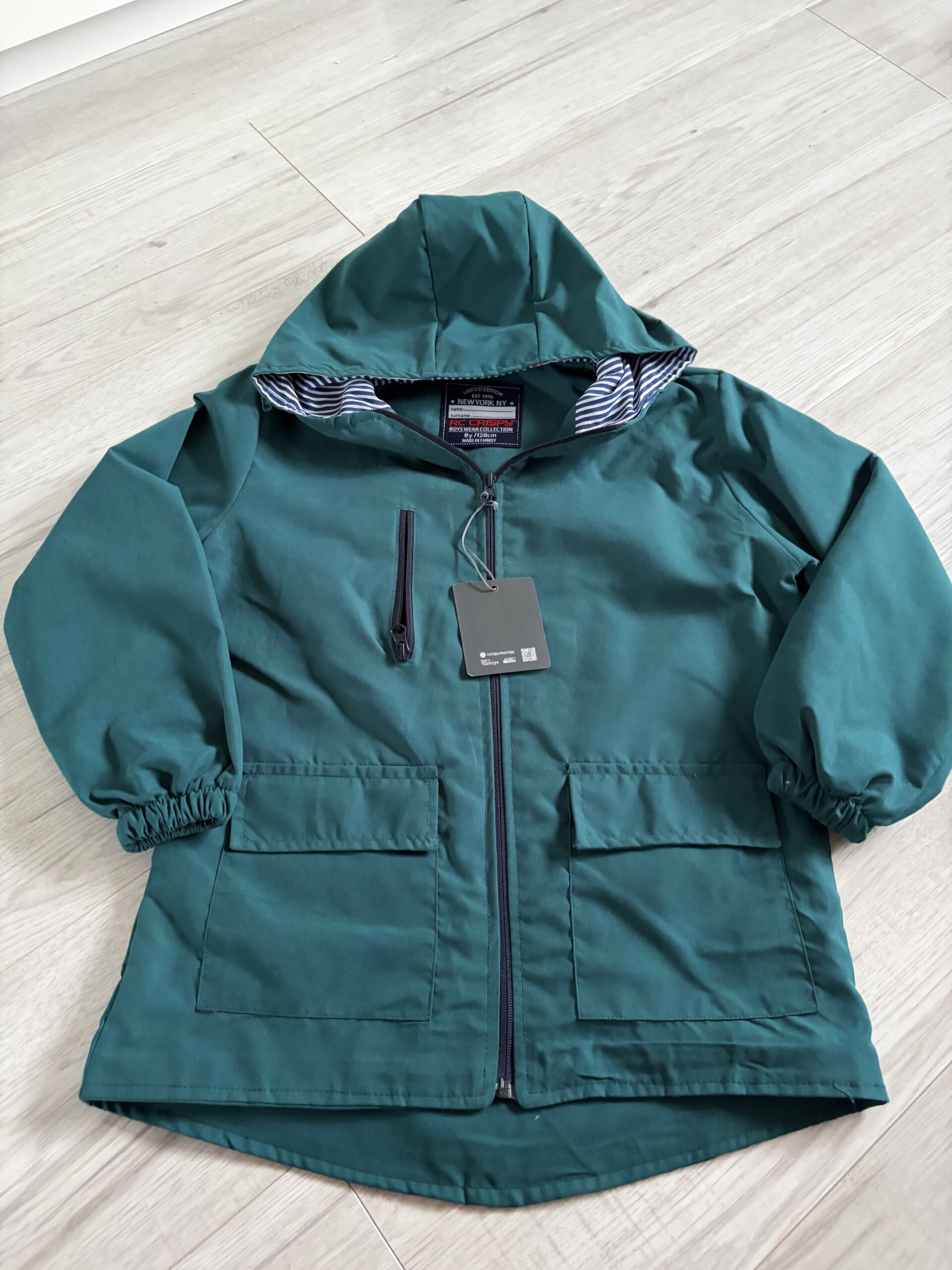 Wiosenna kurtka ,w kolorze butelkowej zieleni, z kieszeniami oraz kapturem. Tył kurtki przedłużany .