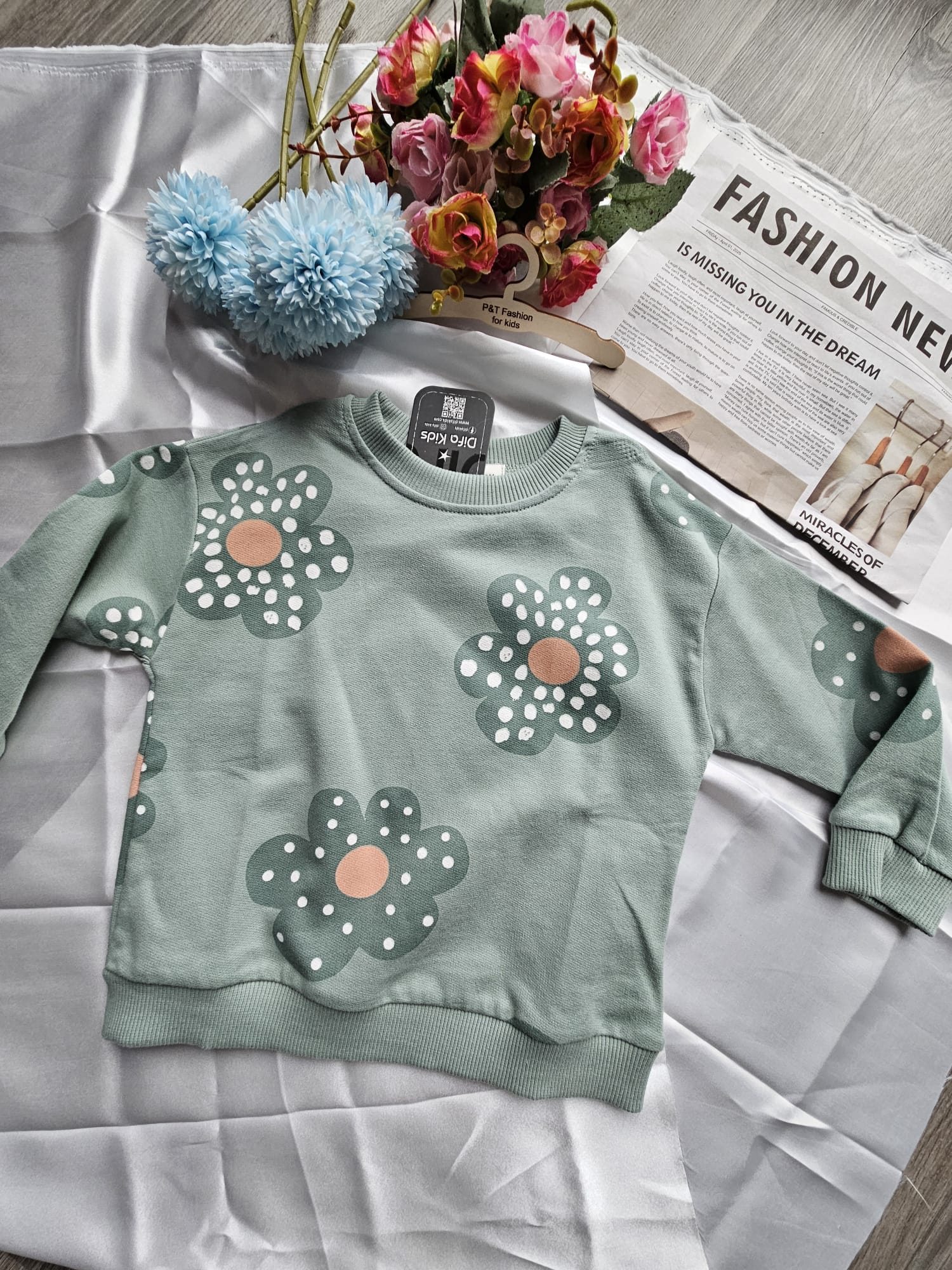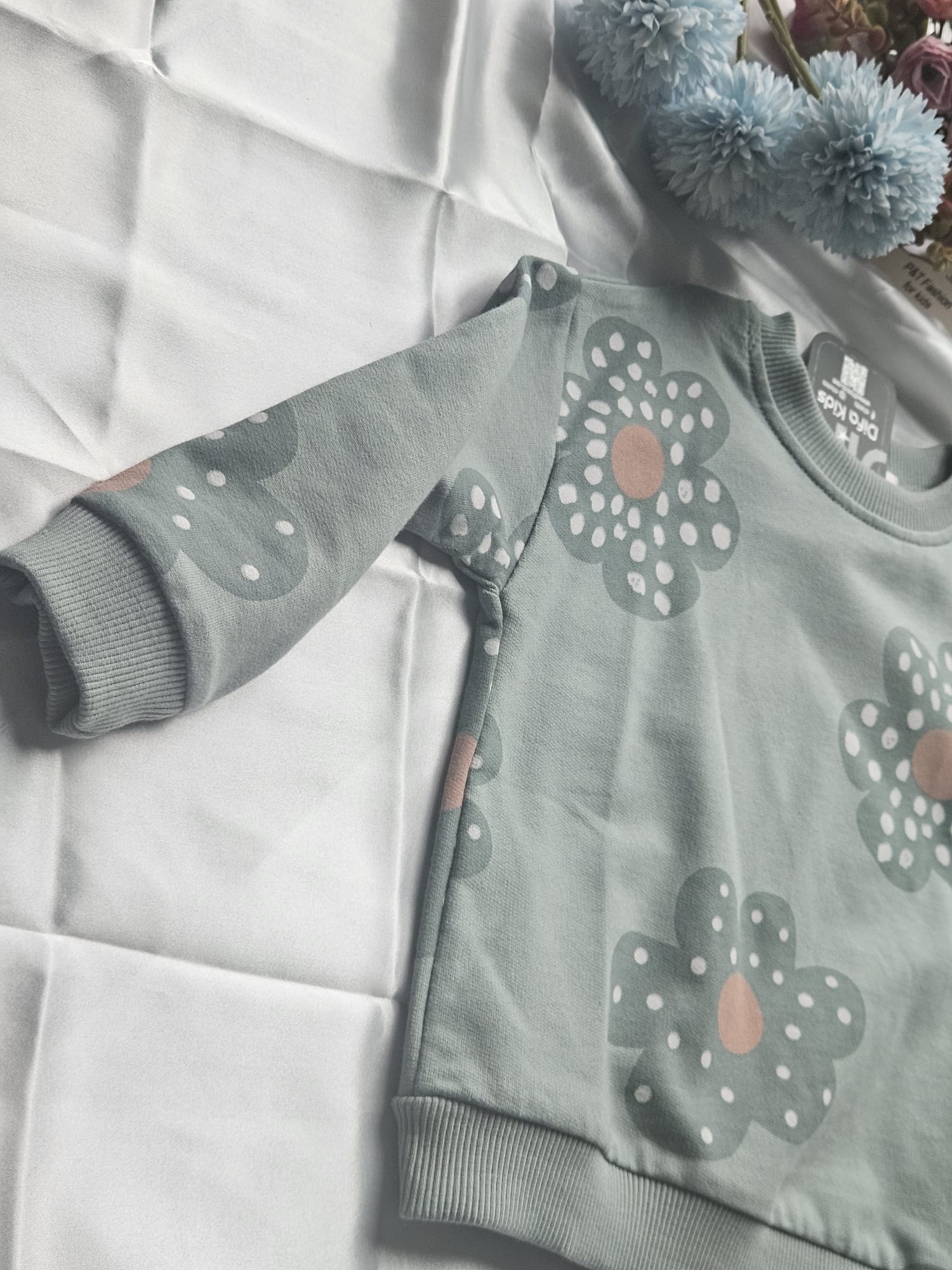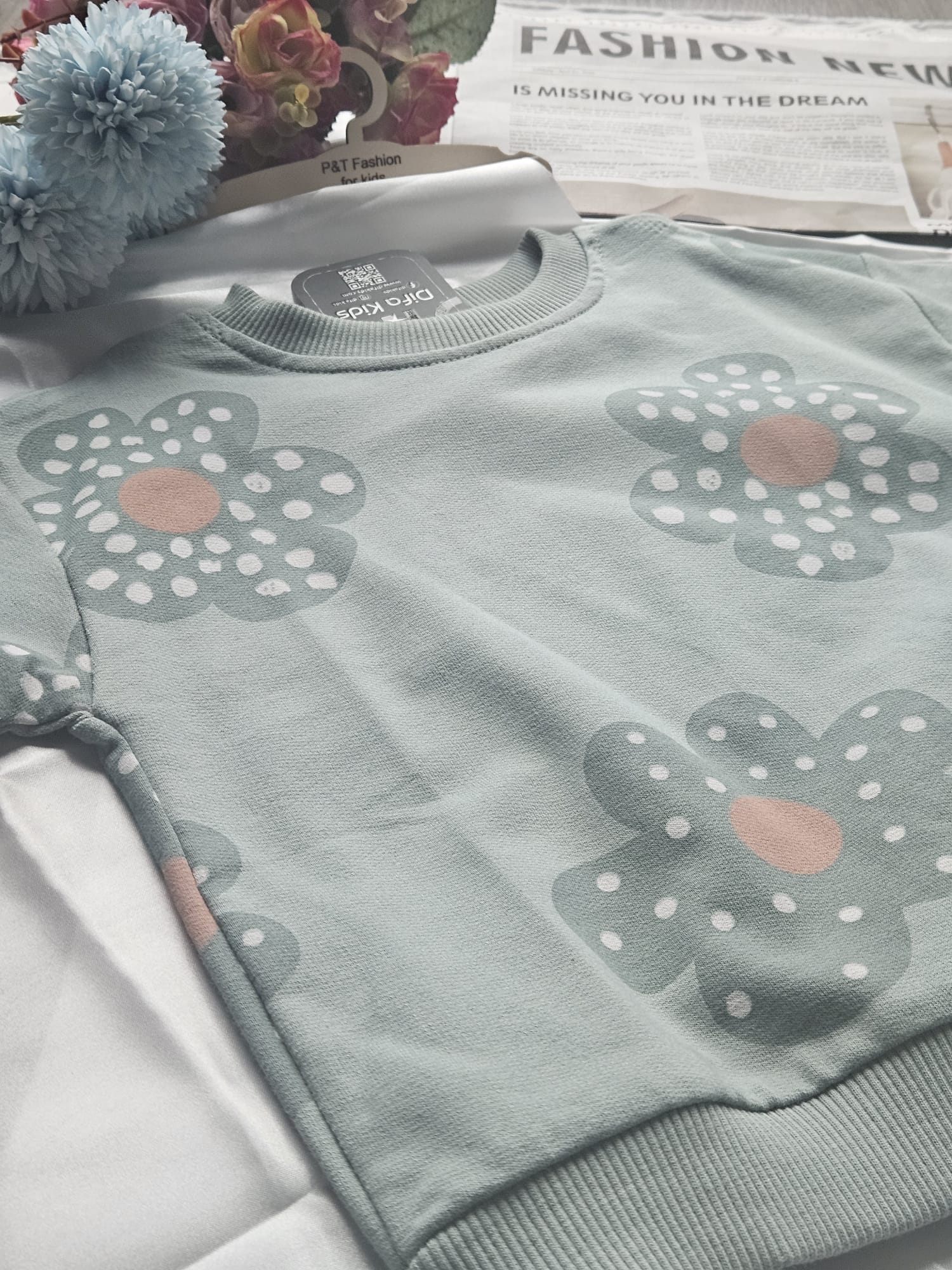 Wygodna i urocza bluza z delikatnym motywem kwiatków. Miękki materiał i klasyczny krój zakładany przez głowę zapewniają komfort podczas codziennych zabaw i spacerów. Idealna do tworzenia lekkich, dziewczęcych stylizacji. 🌸💚